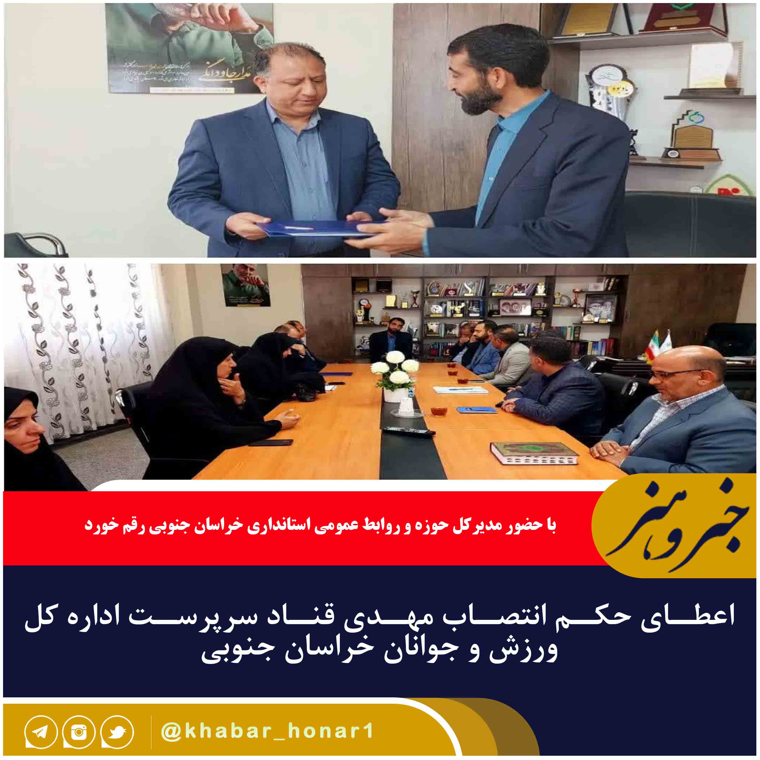 مهدی مرادی به نیابت از استاندار خراسان، حکم انتصاب مهدی قناد سرپرست اداره کل ورزش و جوانان استان را اعطا کرد.