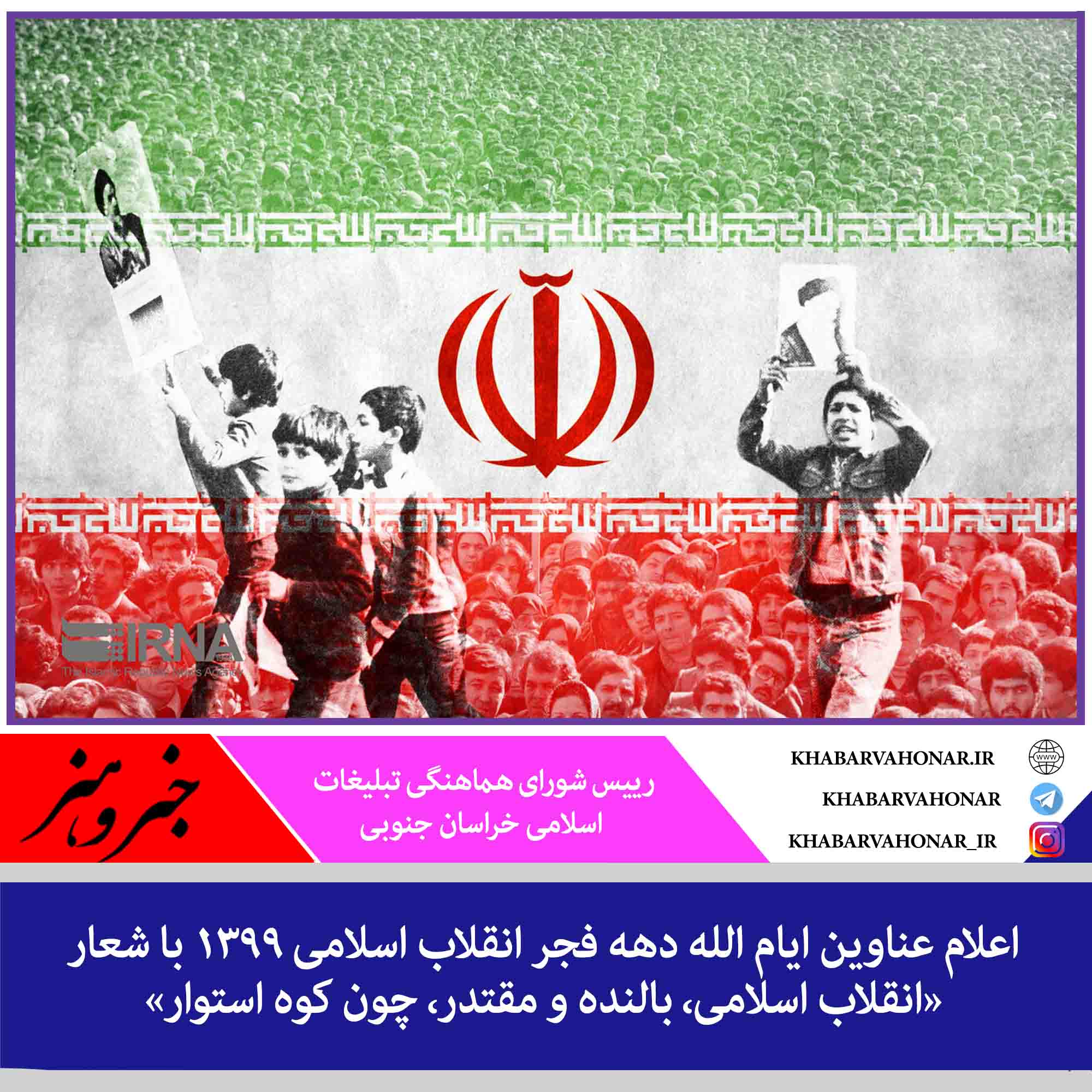 رئیس شورای هماهنگی تبلیغات اسلامی استان شعار محوری و سراسری دهه فجر ۱۳۹۹ را «انقلاب اسلامی، بالنده و مقتدر، چون کوه استوار»اعلام نمود و ادامه داد:تعیین عناوین اختصاصی ایام الله دهه فجر از ۱۲ تا ۲۲ بهمن بر مبنای اهداف، سیاست ها و راهبردهای چهل و دومین سالگرد پیروزی شکوهمند انقلاب اسلامی به منظور محور و چارچوب فعالیتهای هر روز از ایام در حوزه تبیین، مراسم، بیان دستاوردها، روشنگری و پاسخ به شبهات و فعالیتهای میدانی است که عناوین ایام الله دهه فجر چهل و دومین سالگرد پیروزی انقلاب اسلامی عبارتند از: