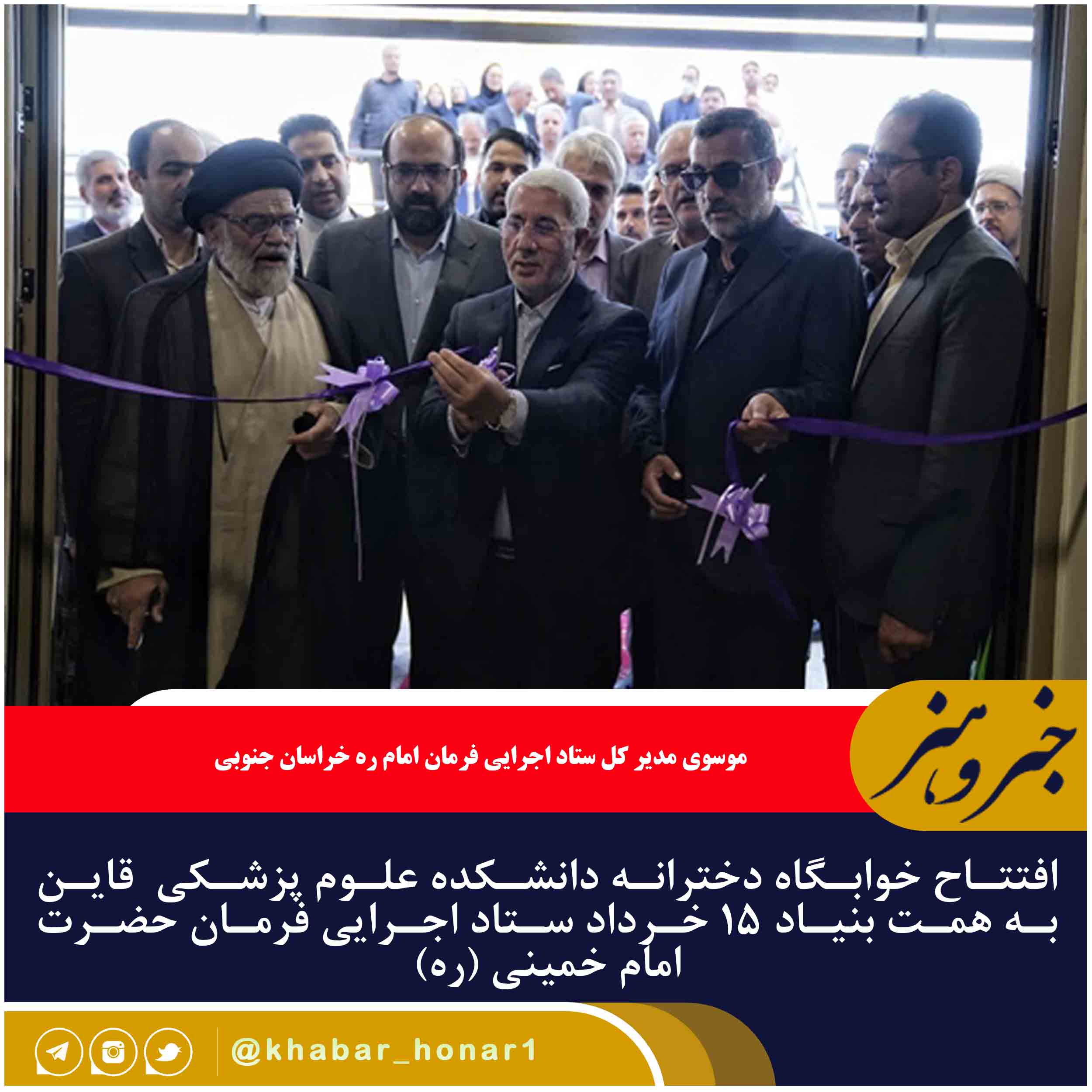 موسوی مدیر کل ستاد اجرایی فرمان امام ره خراسان جنوبی افزود : خوابگاه دخترانه سردار شهیدحاج قاسم سلیمانی دانشکده علوم پزشکی به همت بنیاد ۱۵ خرداد ستاد اجرایی فرمان حضرت امام ره شهرستان قاینات به بهره برداری رسید.