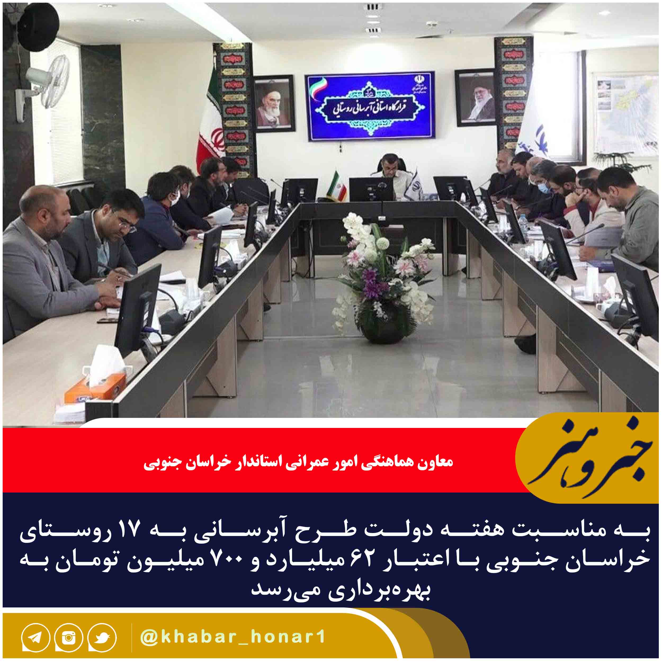 معاون هماهنگی امور عمرانی استاندار خراسان جنوبی اعلام کرد: به مناسبت هفته دولت طرح آبرسانی به ۱۷ روستای خراسان جنوبی با اعتبار ۶۲ میلیارد و ۷۰۰ میلیون تومان به بهرهبرداری میرسد.