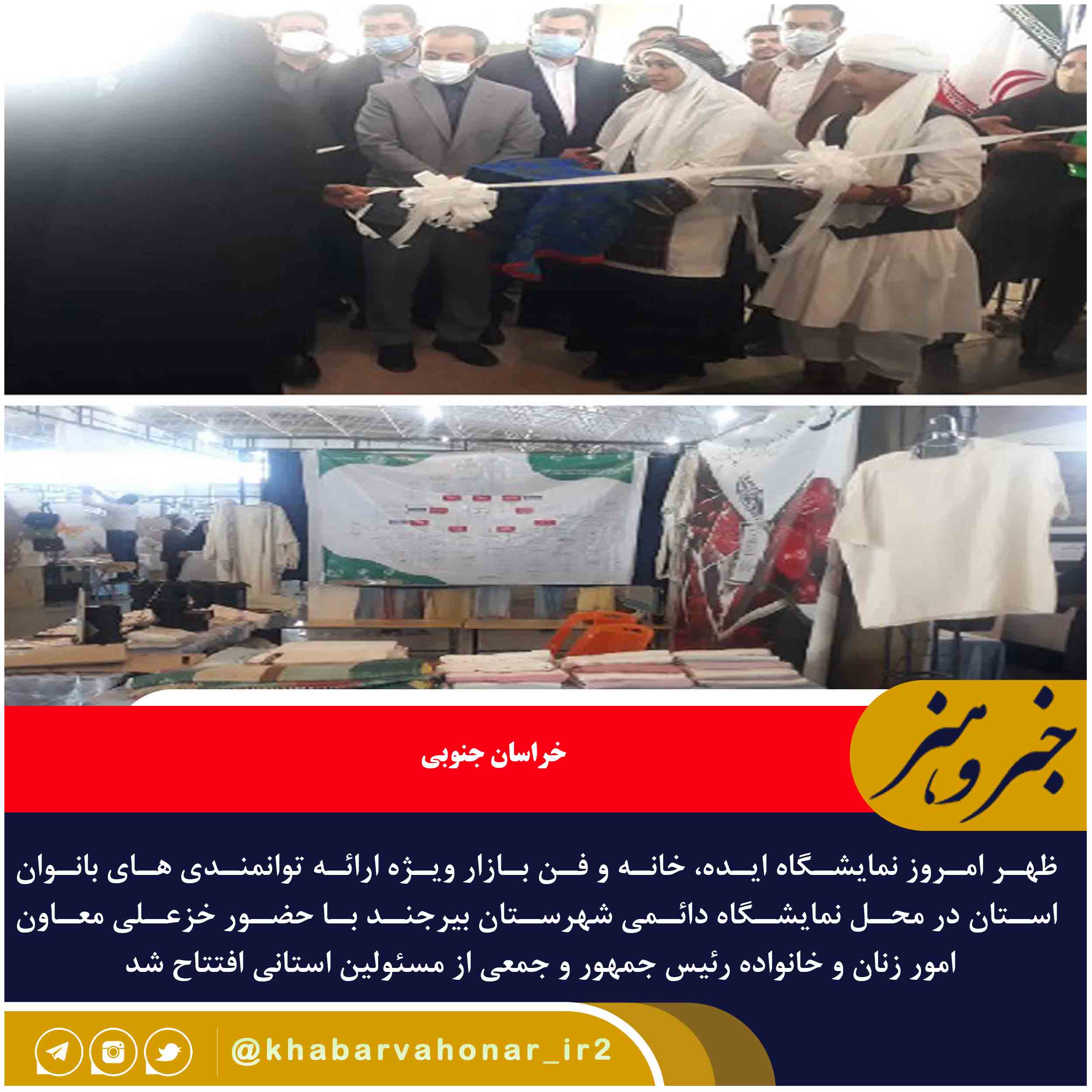 ? ظهر امروز نمایشگاه ایده، خانه و فن بازار ویژه ارائه توانمندی های بانوان استان در محل نمایشگاه دائمی شهرستان بیرجند با حضور خزعلی معاون امور زنان و خانواده رئیس جمهور و جمعی از مسئولین استانی افتتاح شد.