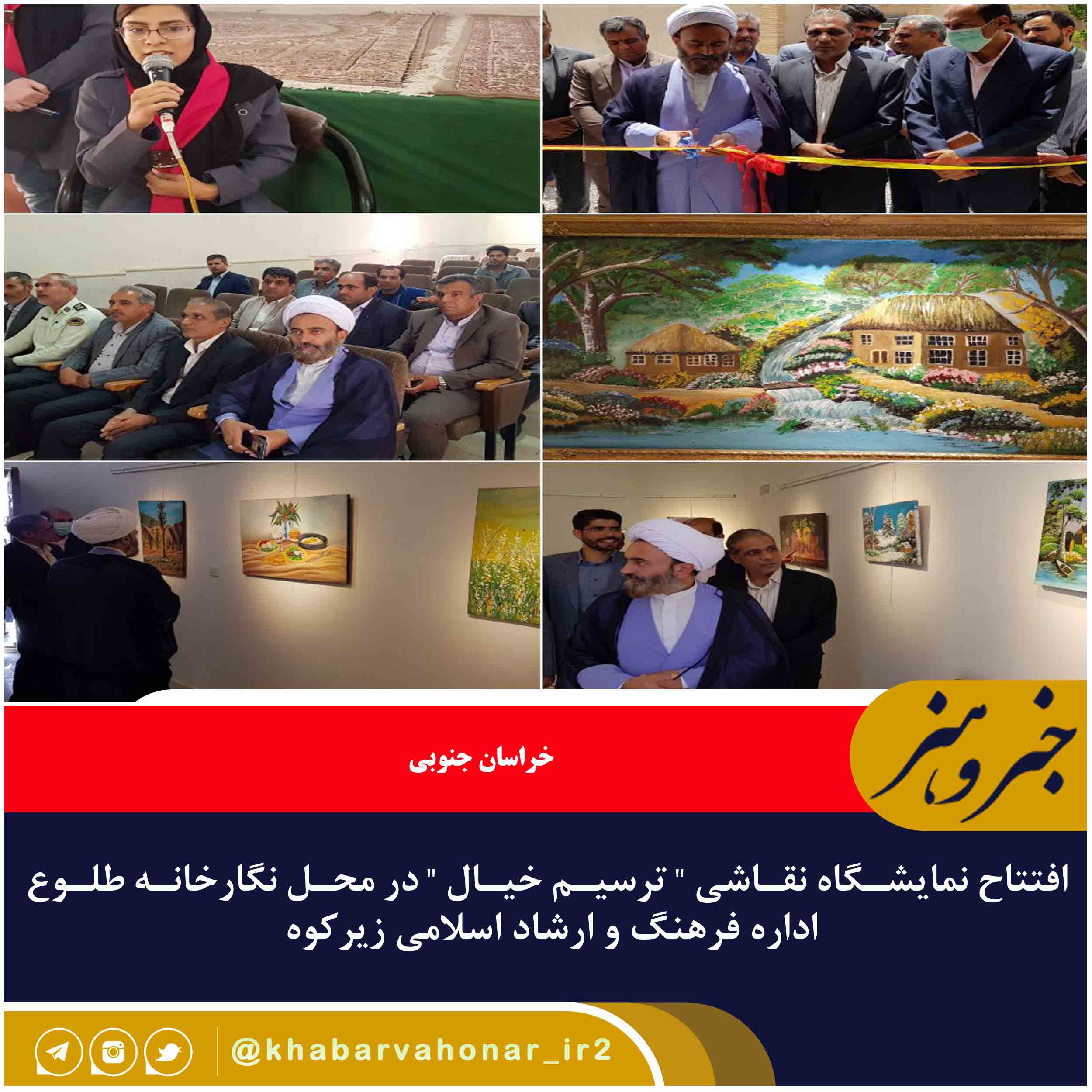 ?این نمایشگاه صبح امروز با حضور امام جمعه شهرستان ، معاون عمرانی فرماندار و جمعی دیگر از مسئولین شهرستان زیرکوه در محل سالن آمفی تئاتر اداره فرهنگ و ارشاد گشایش یافت و تا تاریخ ۷ تیرماه از ساعت ۸ الی ۱۳ جهت بازدید علاقه مندان در محل نگارخانه طلوع اداره فرهنگ و ارشاد اسلامی زیرکوه دایر است.