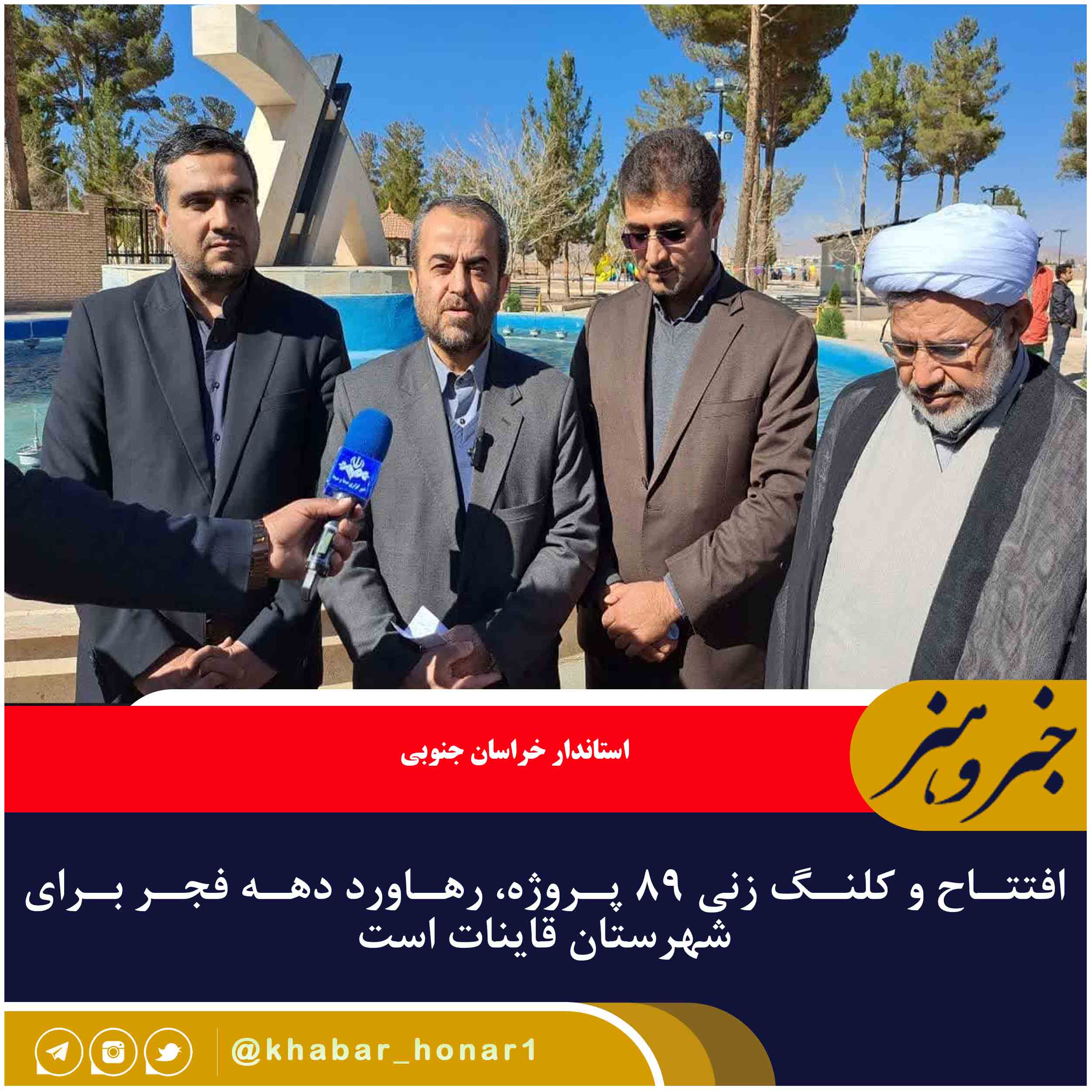 ?استاندار خراسان جنوبی گفت: در دهه فجر امسال، تعداد ۸۹ پروژه در شهرستان قاینات افتتاح و کلنگ زنی می شود.
