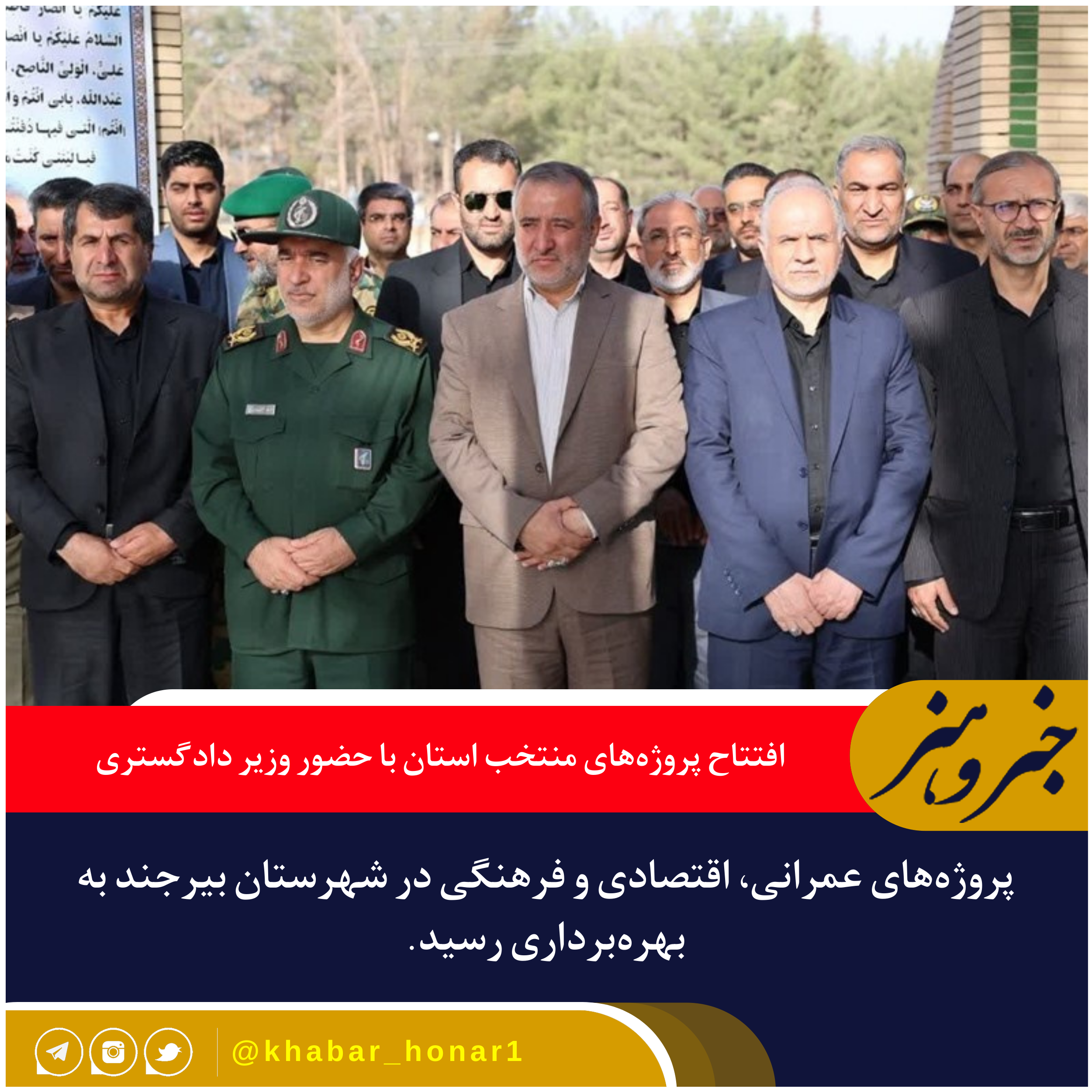 به گزارش خبر و هنر، پروژههای عمرانی، اقتصادی و فرهنگی منتخب استان خراسان جنوبی در شهرستان بیرجند با حضور وزیر دادگستری، استاندار خراسان جنوبی، نمایندگان مردم و جمعی از مدیران کل دستگاههای اجرایی، خانوادههای شهدا و اصحاب رسانه به بهرهبرداری رسید.