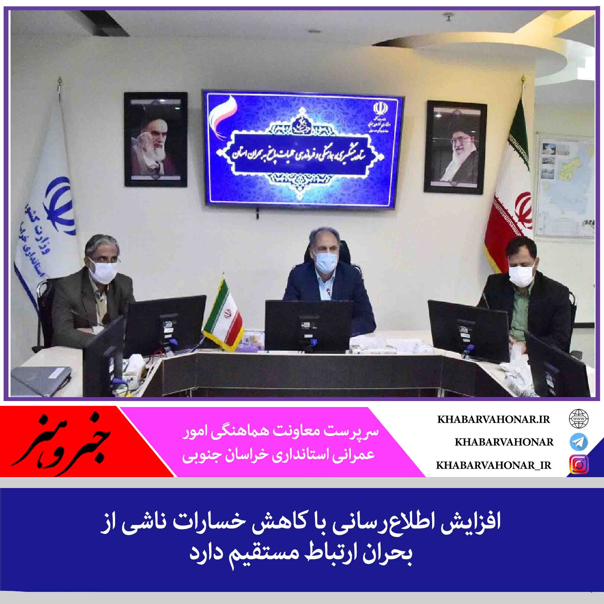 سرپرست معاونت هماهنگی امور عمرانی استانداری خراسان جنوبی گفت: بین افزایش اطلاعرسانی با کاهش حجم خسارتهای ناشی از بحران ارتباط مستقیم وجود دارد و برای استفاده از امکانات دستگاههای دیگر باید قبل از بروز فصل بارندگی، نیازها بررسی شود.