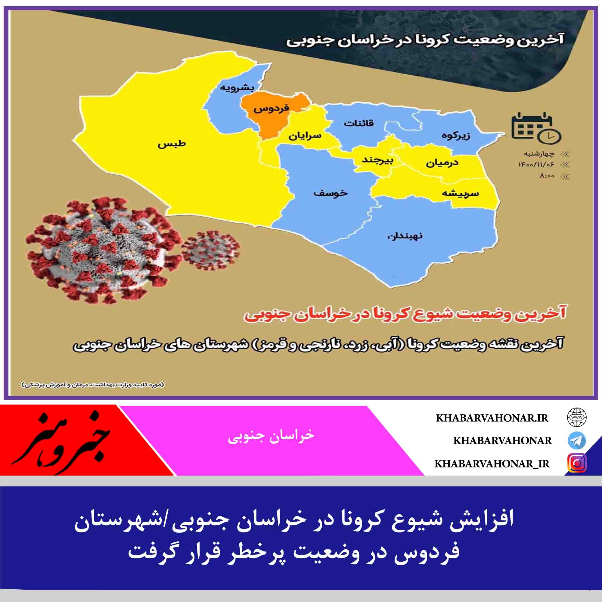 افزایش شیوع کرونا در خراسان جنوبی/شهرستان فردوس در وضعیت پرخطر قرار گرفت