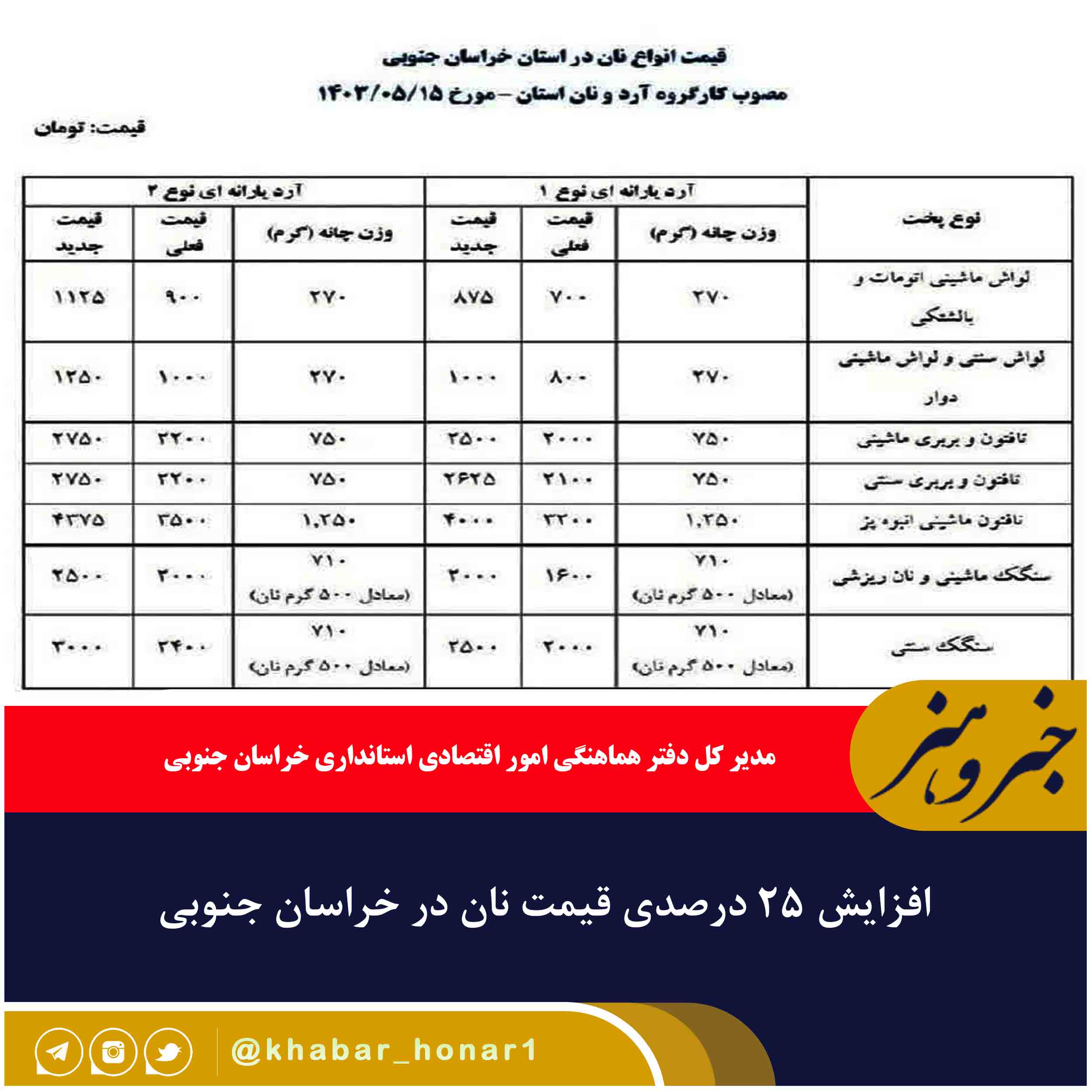 🔸مدیر کل دفتر هماهنگی امور اقتصادی استانداری گفت: پیرو جلسه کارگروه آرد و نان خراسان جنوبی در ۱۵ مرداد ۱۴۰۳ قیمت نان در استان به مقدار ۲۵ درصد افزایش یافت.