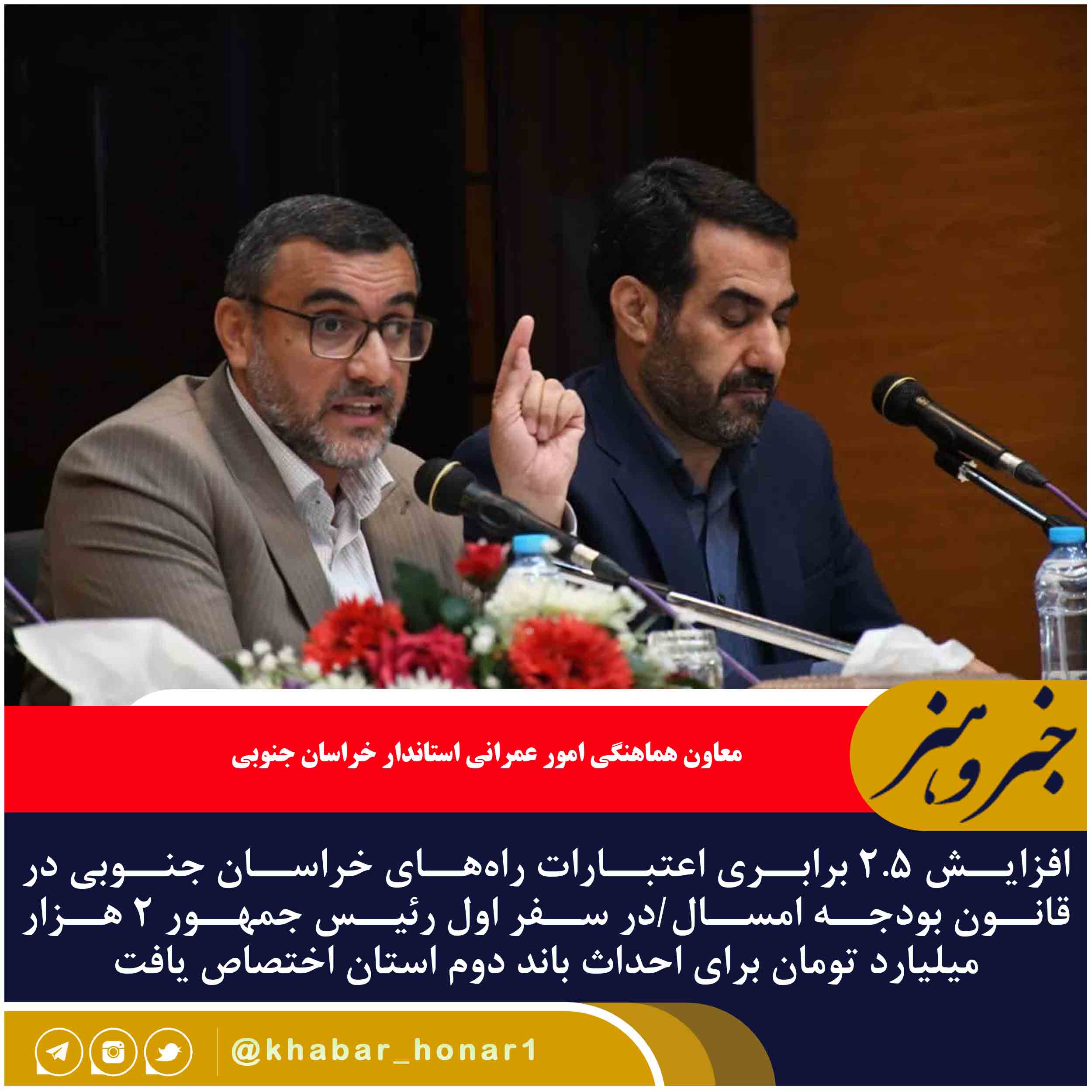 ?معاون هماهنگی امور عمرانی استاندار خراسان جنوبی با بیان اینکه سال گذشته در سفر اول رئیس جمهور ۲ هزار میلیارد تومان برای احداث باند دوم استان اختصاص یافت، گفت: در قانون بودجه امسال نسبت به سال قبل ۲.۵ برابر افزایش اعتبارات زیرساخت در حوزه راههای استان داریم.
