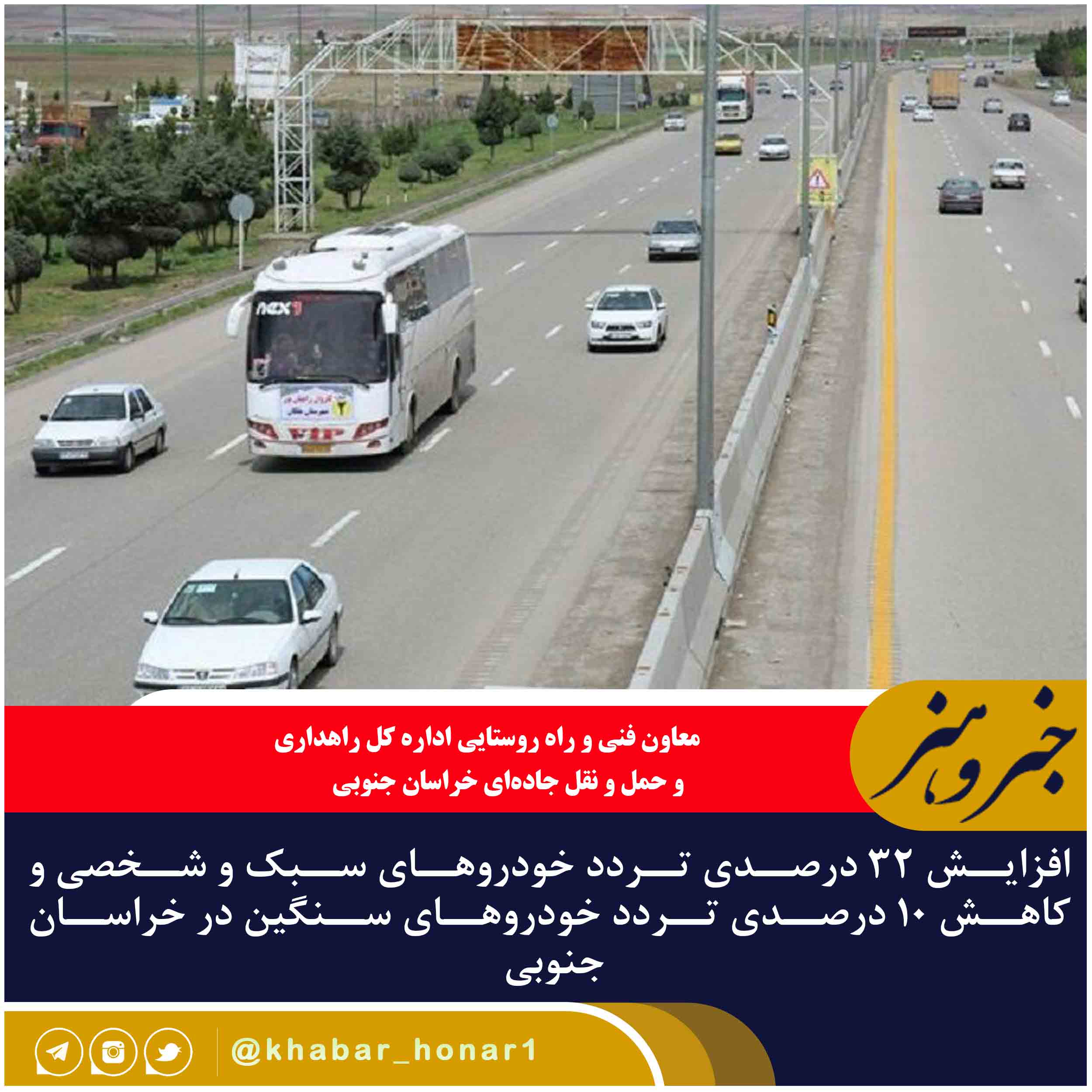 معاون فنی و راه روستایی اداره کل راهداری و حمل و نقل جادهای خراسان جنوبی گفت: در پنج ماه نخست امسال بیش از ۳۲ میلیون تردد وسایل نقلیه سبک و سنگین در جادههای استان ثبت شد که نسبت به مدت مشابه سال قبل ۳۲ درصد افزایش یافت.