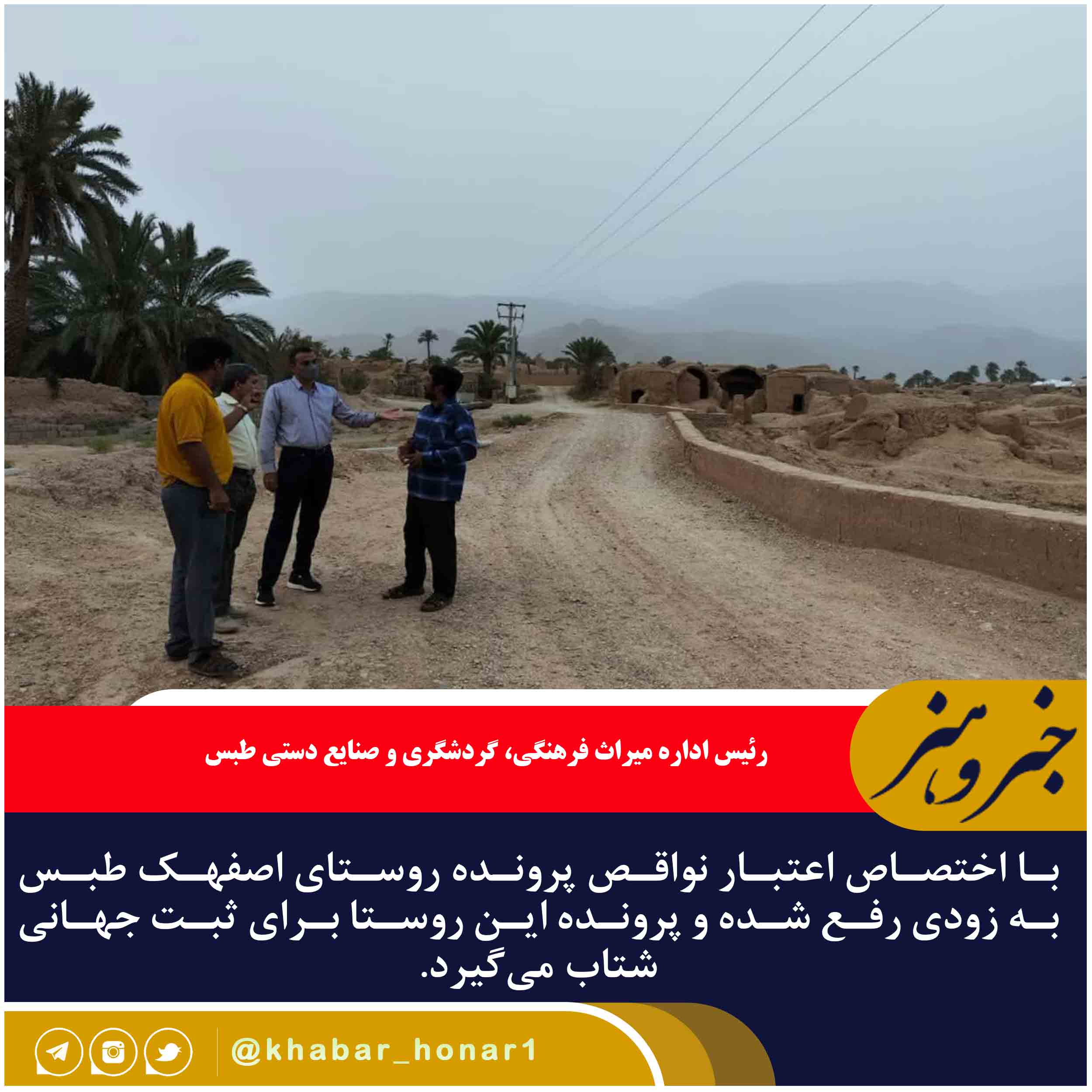 رئیس اداره میراث فرهنگی، گردشگری و صنایع دستی طبس گفت: با اختصاص اعتبار نواقص پرونده روستای اصفهک طبس به زودی رفع شده و پرونده این روستا برای ثبت جهانی شتاب میگیرد.