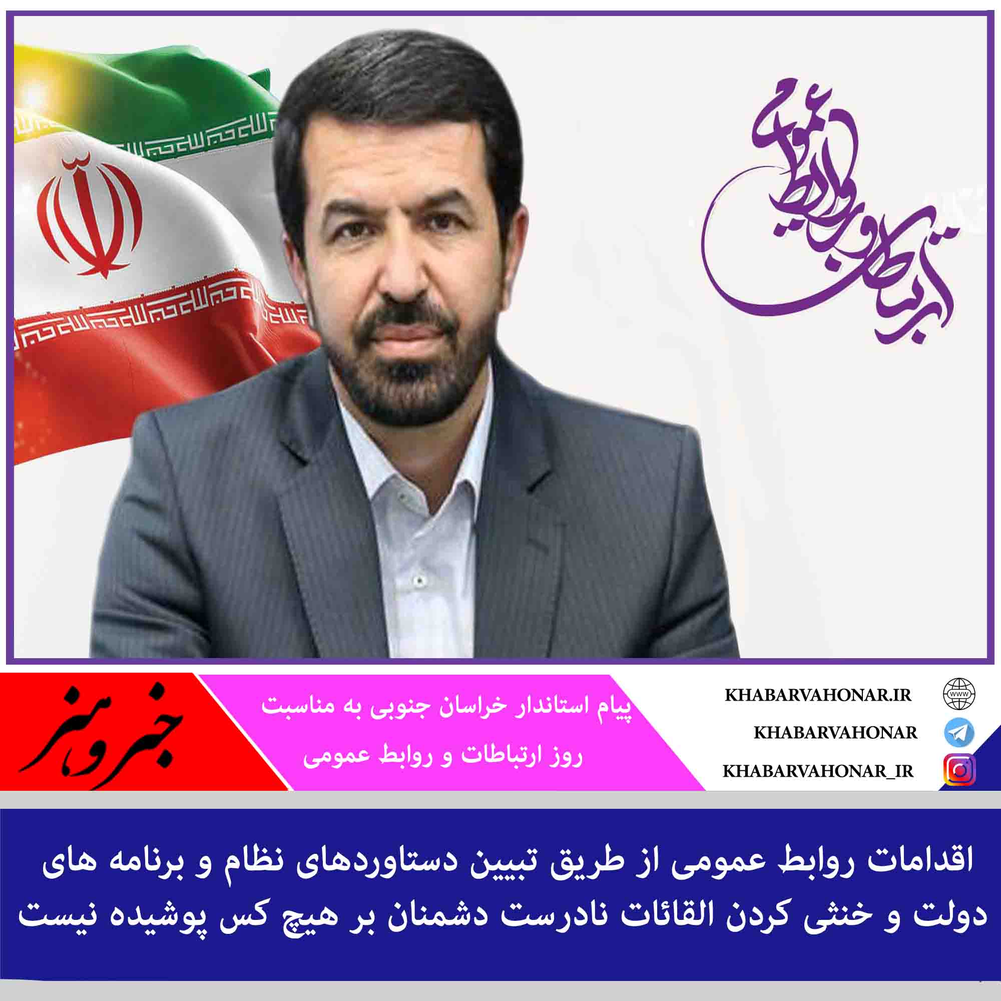 ?اینجانب،ضمن تبریک روز ملی”ارتباطات و روابط عمومی” به تمامی فعالان این عرصه به ویژه مدیران ، کارشناسان و کارکنان شاغل در روابط عمومی های دستگاه های اجرایی و سازمانها و نهادهای بخش خصوصی در استان خراسان جنوبی، تلاش بی شائبه این عزیزان را ارج می نهم.