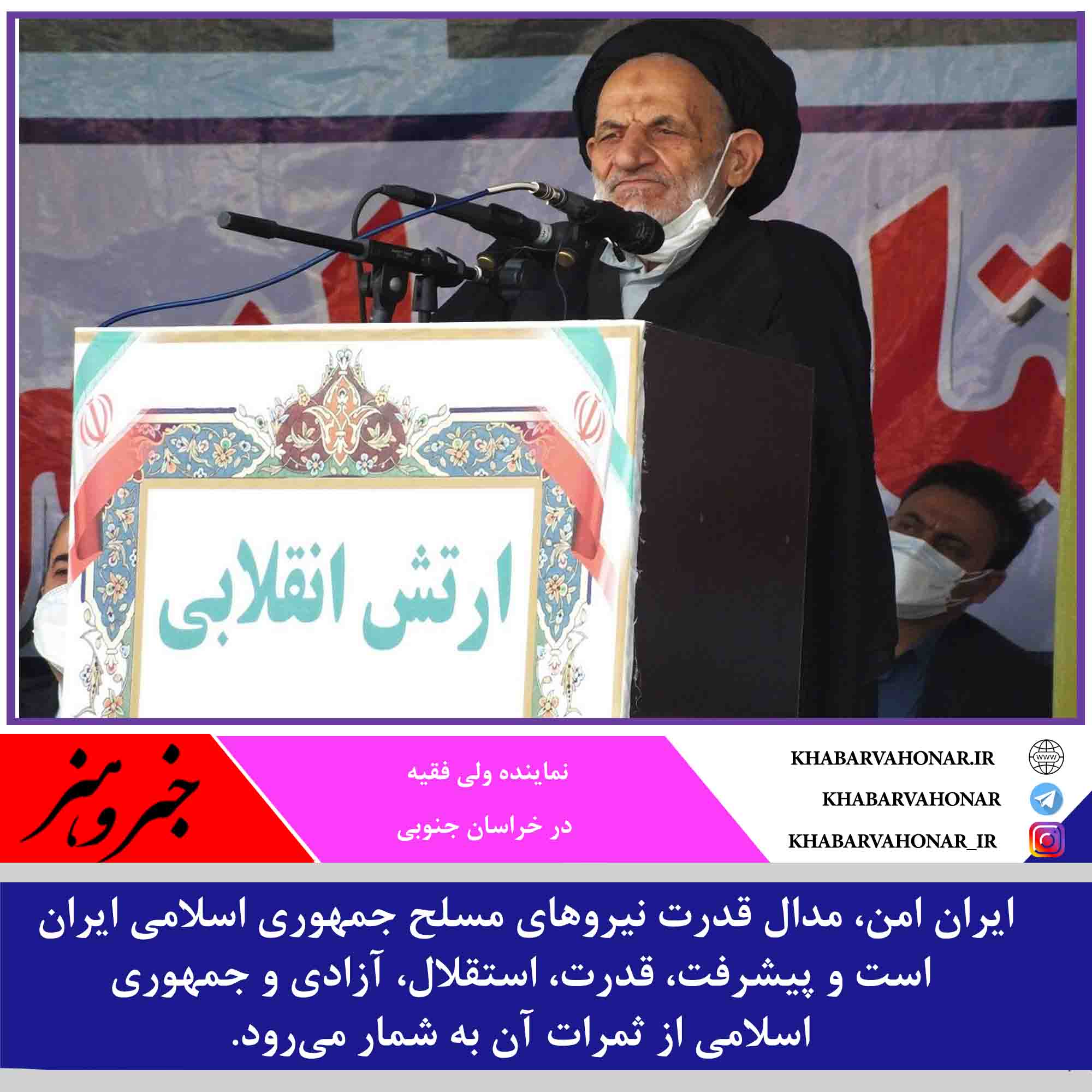 نماینده ولی فقیه در خراسان جنوبی و امام جمعه بیرجند گفت: ایران امن، مدال قدرت نیروهای مسلح جمهوری اسلامی ایران است و پیشرفت، قدرت، استقلال، آزادی و جمهوری اسلامی از ثمرات آن به شمار میرود.