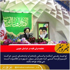 نماینده ولی فقیه در خراسان جنوبی و امام جمعه بیرجند گفت: توحید یعنی اینکه براساس بایدها و نبایدهای دین حرکت کنیم وگرنه کسی که معیارش پول، شهرت و طاغوت است نمیتواند موحد باشد.