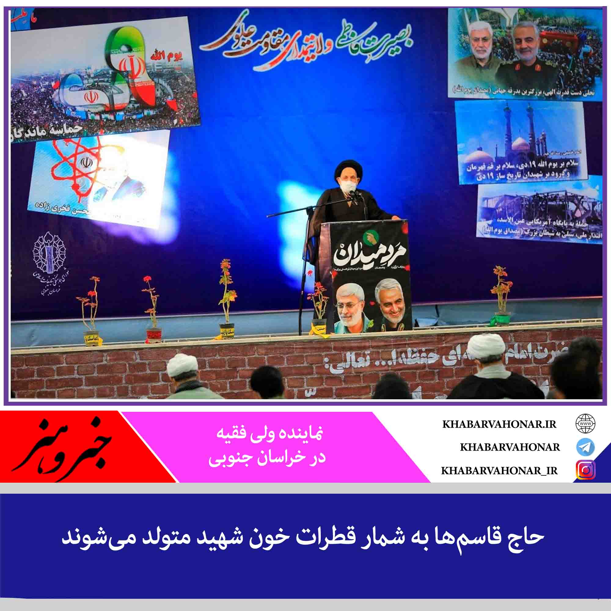 نماینده ولی فقیه در خراسان جنوبی و امام جمعه بیرجند گفت: به شمار قطرات خونی که به ناحق از شهید سلیمانی به زمین ریخته شد، حاج قاسمها متولد میشوند.