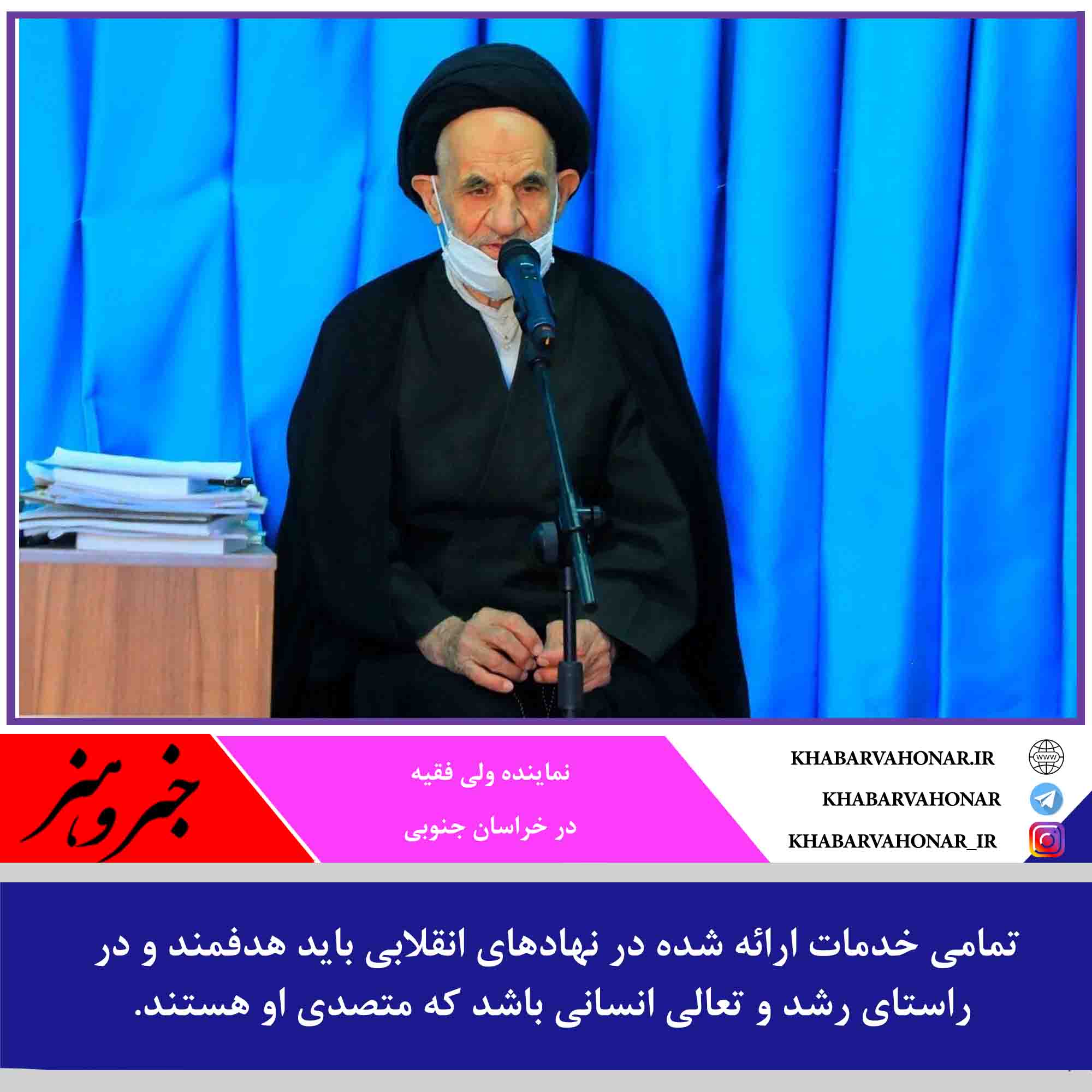 نماینده ولی فقیه در خراسان جنوبی و امام جمعه بیرجند گفت: تمامی خدمات ارائه شده در نهادهای انقلابی باید هدفمند و در راستای رشد و تعالی انسانی باشد که متصدی او هستند.