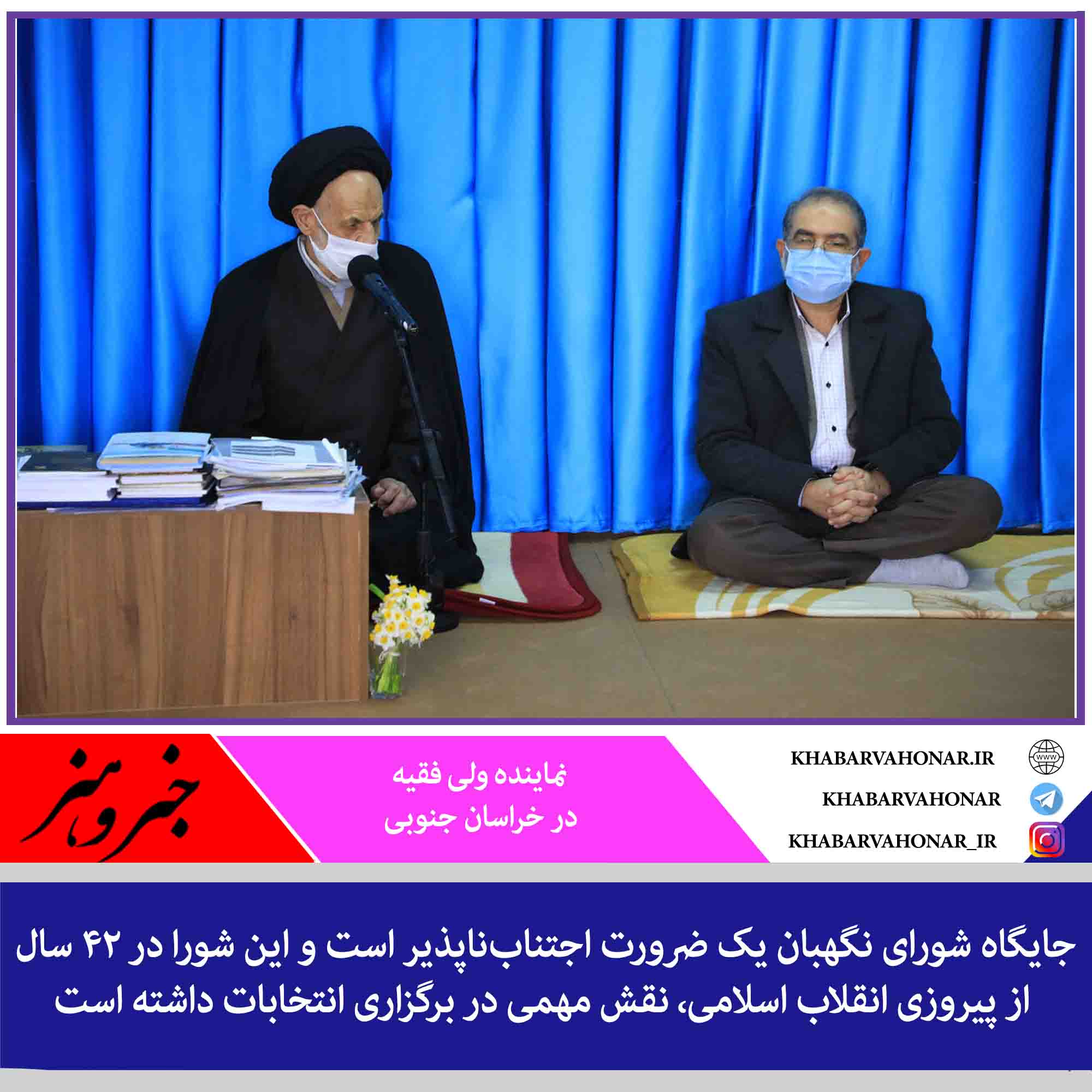 نماینده ولی فقیه در خراسان جنوبی و امام جمعه بیرجند گفت: جایگاه شورای نگهبان یک ضرورت اجتنابناپذیر است و این شورا در ۴۲ سال از پیروزی انقلاب اسلامی، نقش مهمی در برگزاری انتخابات داشته است.