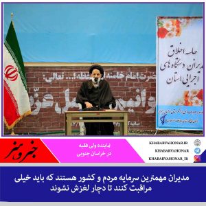 نماینده ولی فقیه در خراسان جنوبی و امام جمعه بیرجند گفت: مدیران مهمترین سرمایه مردم و کشور هستند که باید خیلی مراقبت کنند تا دچار لغزش نشوند.