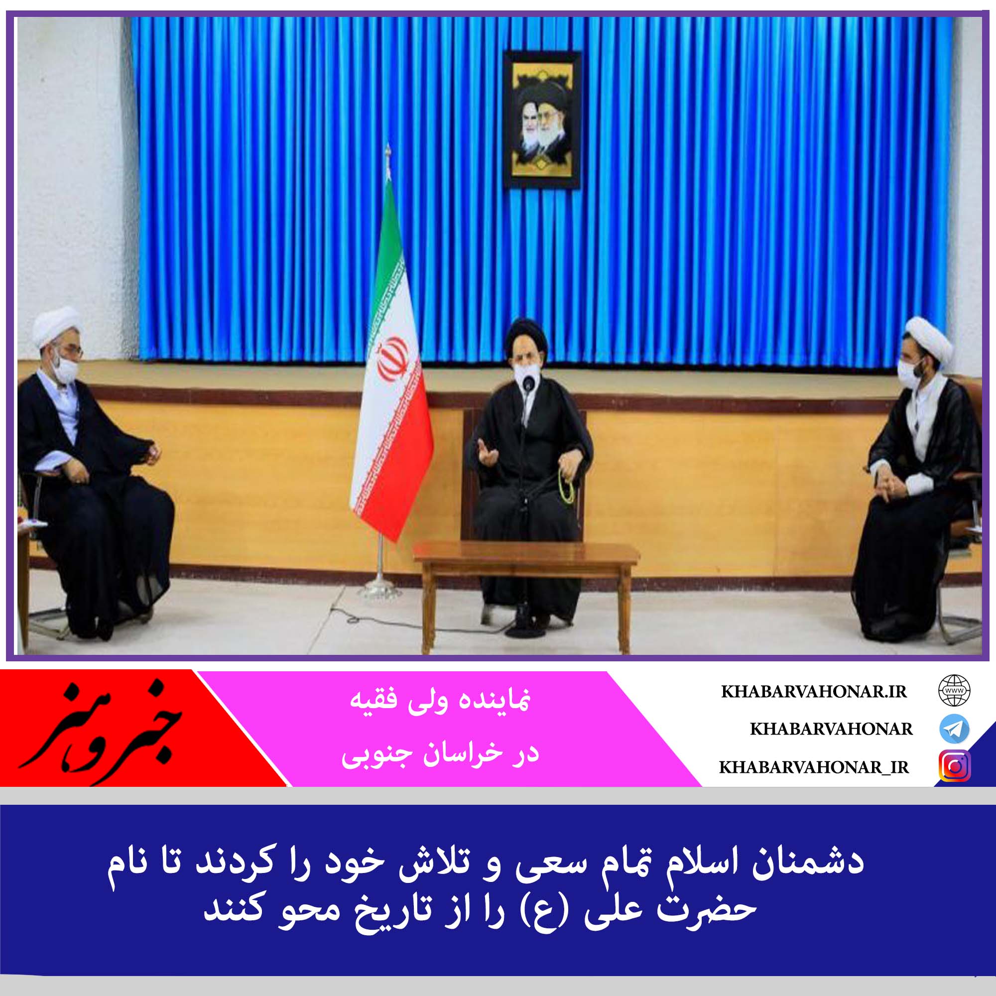 نماینده ولی فقیه در خراسان جنوبی و امام جمعه بیرجند گفت: دشمنان اسلام تمام سعی و تلاش خود را کردند تا نام حضرت علی (ع) را از تاریخ محو کنند اما نه تنها محو نشد بلکه امروز دنیا را پر کرده است.