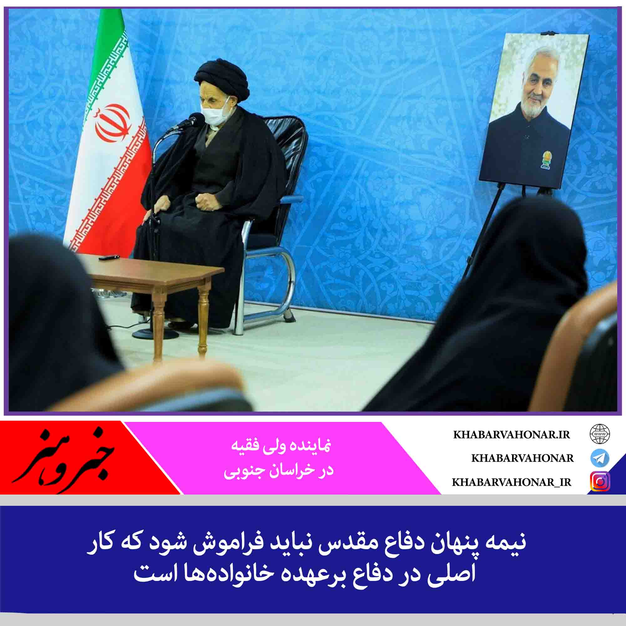 نماینده ولی فقیه در خراسان جنوبی و امام جمعه بیرجند گفت: نیمه پنهان دفاع مقدس نباید فراموش شود که کار اصلی در دفاع برعهده خانوادهها است.