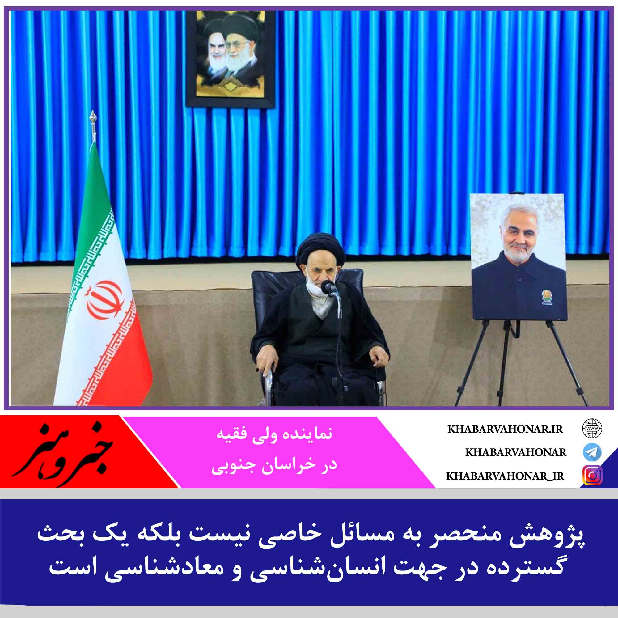 نماینده ولی فقیه در خراسان جنوبی و امام جمعه بیرجند گفت: پژوهش منحصر به مسائل خاصی نیست بلکه یک بحث گسترده در جهت انسانشناسی و معادشناسی است.