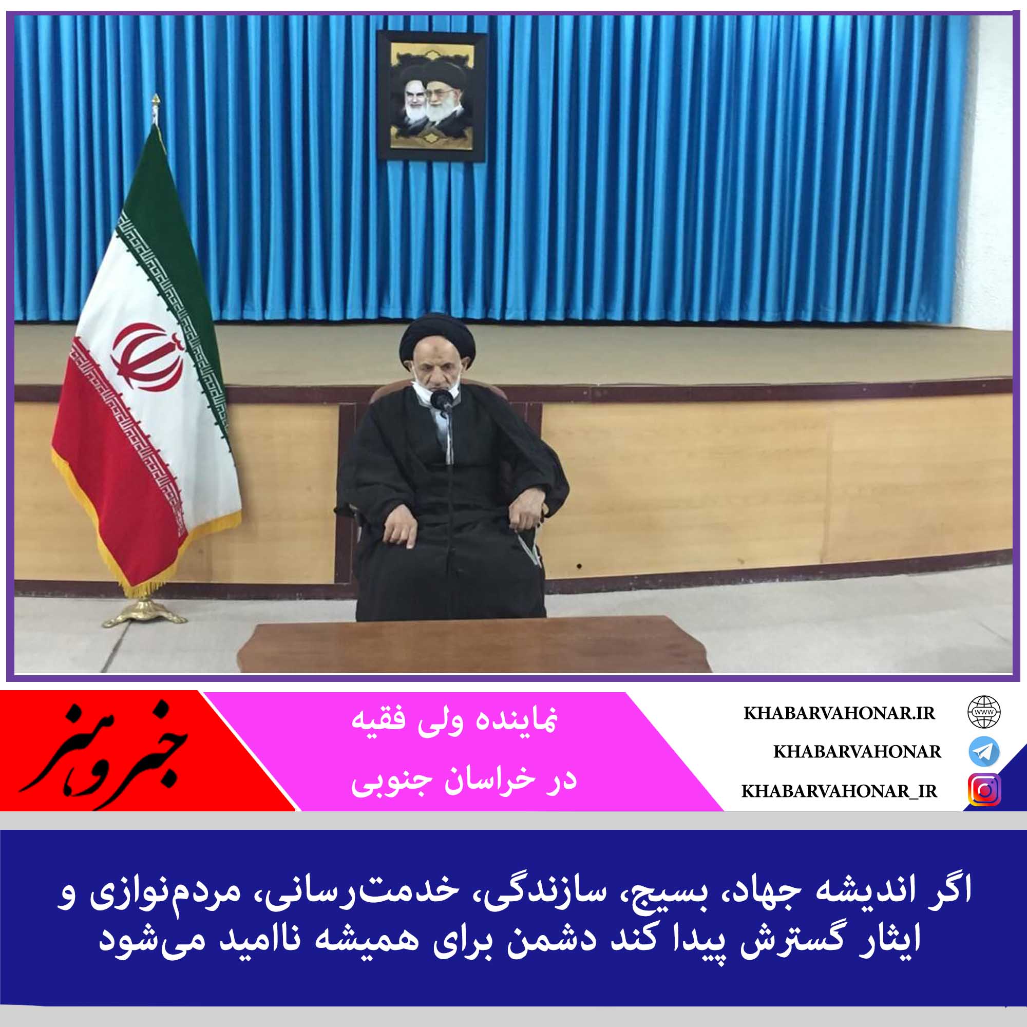نماینده ولی فقیه در خراسان جنوبی و امام جمعه بیرجند گفت: اگر اندیشه جهاد، بسیج، سازندگی، خدمترسانی، مردمنوازی و ایثار گسترش پیدا کند دشمن برای همیشه ناامید میشود.
