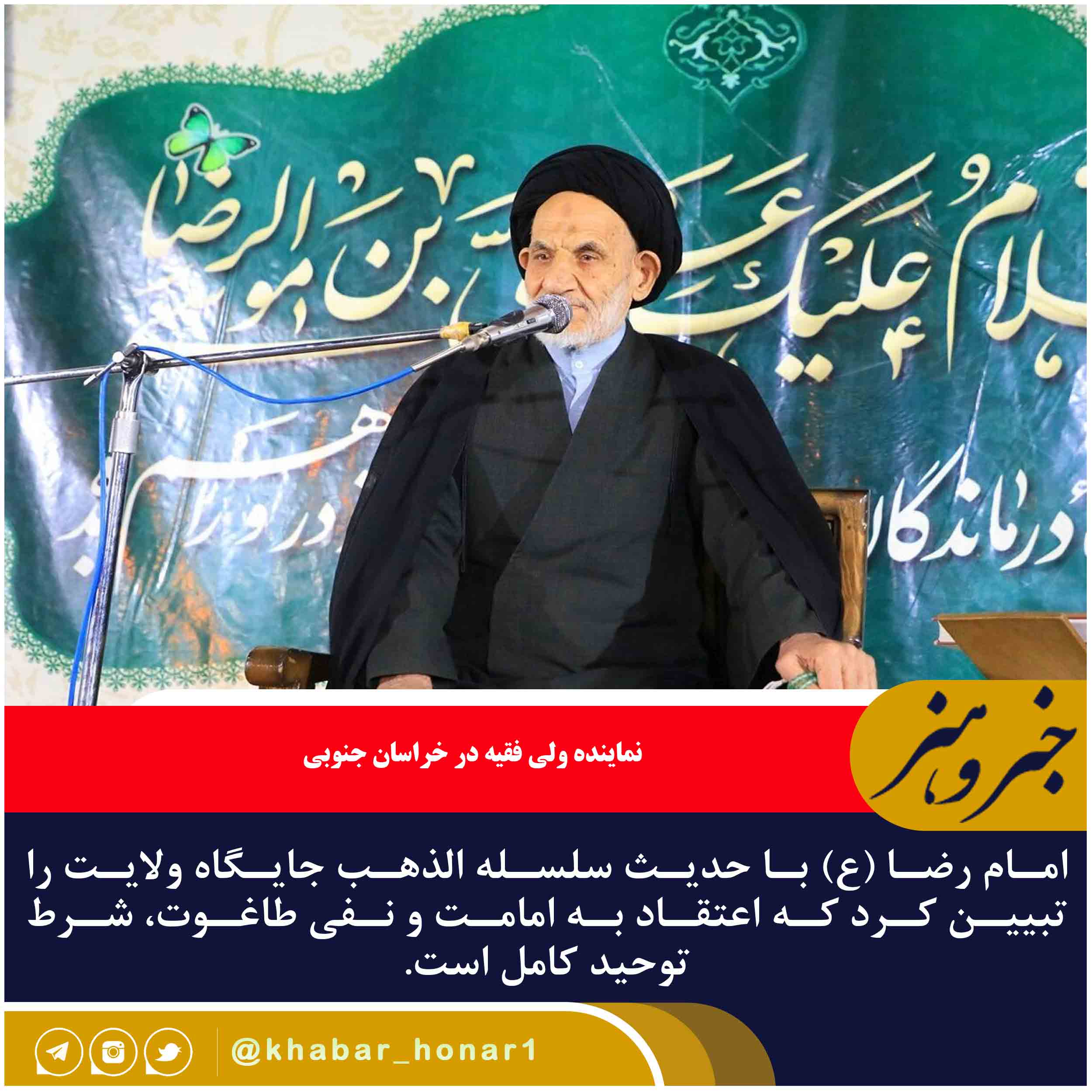 نماینده ولی فقیه در خراسان جنوبی و امام جمعه بیرجند گفت: امام رضا (ع) با حدیث سلسله الذهب جایگاه ولایت را تبیین کرد که اعتقاد به امامت و نفی طاغوت، شرط توحید کامل است.