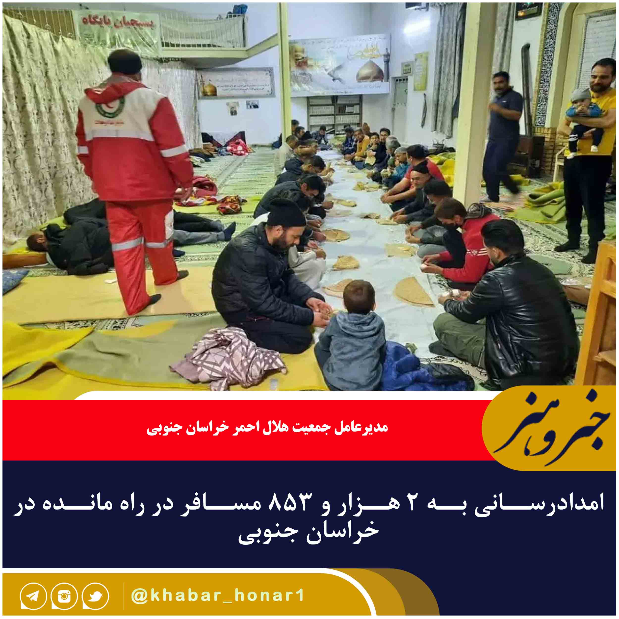 مدیرعامل جمعیت هلال احمر خراسان جنوبی گفت: از صبح روز گذشته تاکنون به ۲ هزار و ۸۵۳ مسافر در راه مانده ناشی از برف و کولاک در جادهها و شهرهای استان خدمترسانی و نسبت به اسکان آنها اقدام شده است.