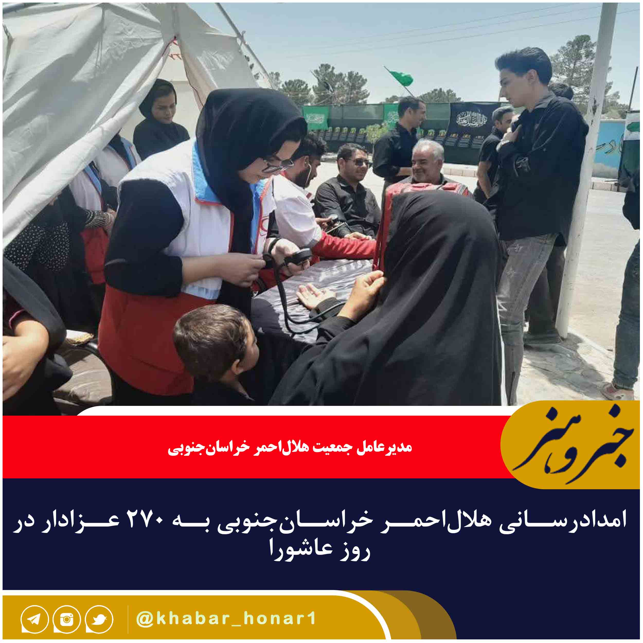 ?مدیرعامل جمعیت هلالاحمر خراسانجنوبی از امدادرسانی این جمعیت به ۲۷۰ نفر از عزاداران اباعبدالله(ع) در روز عاشورا خبر داد.