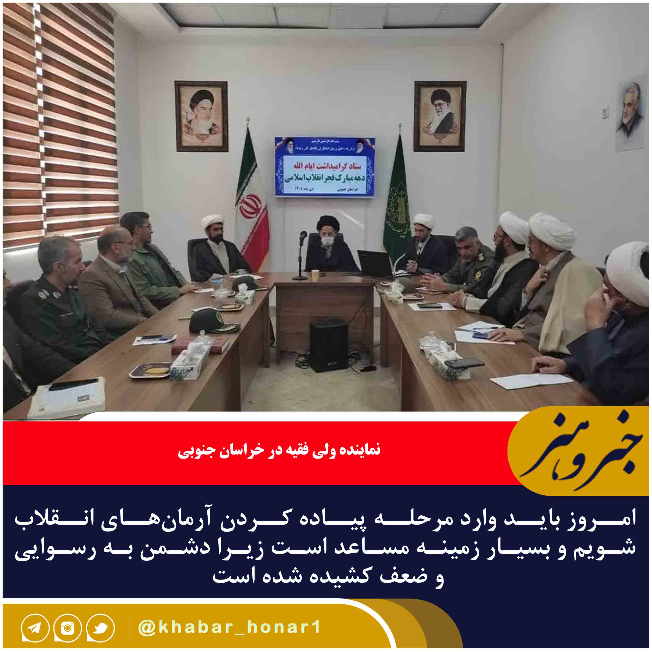 حجتالاسلام و المسلمین سید علیرضا عبادی روز چهارشنبه در نشست تشکیل ستاد استانی گرامیداشت دهه فجر که در محل شورای هماهنگی تبلیغات اسلامی خراسان جنوبی برگزار شد افزود: امروز باید وارد مرحله پیاده کردن آرمانهای انقلاب شویم و بسیار زمینه مساعد است زیرا دشمن به رسوایی و ضعف کشیده شده است.