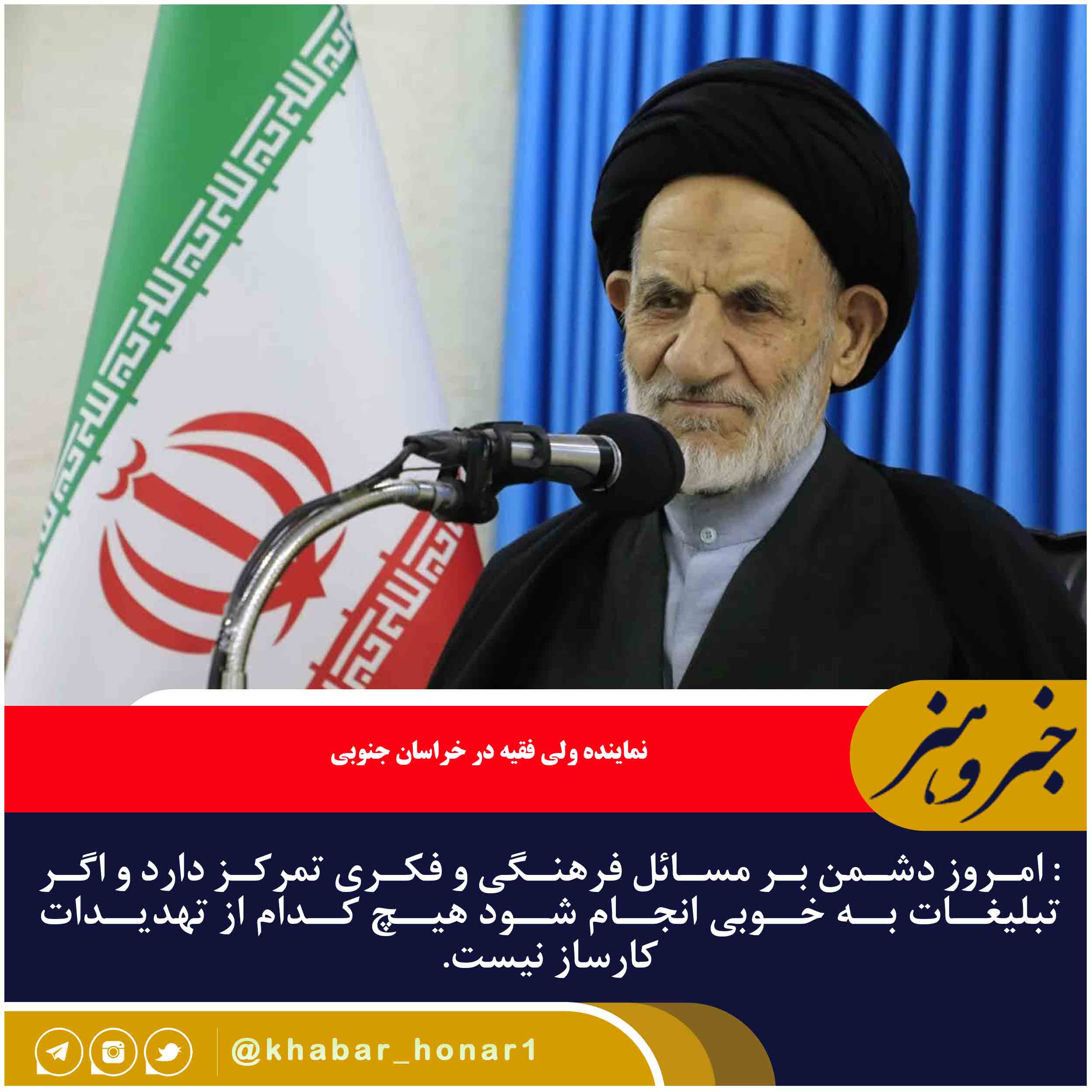نماینده ولی فقیه در خراسان جنوبی و امام جمعه بیرجند گفت: امروز دشمن بر مسائل فرهنگی و فکری تمرکز دارد و اگر تبلیغات به خوبی انجام شود هیچ کدام از تهدیدات کارساز نیست.