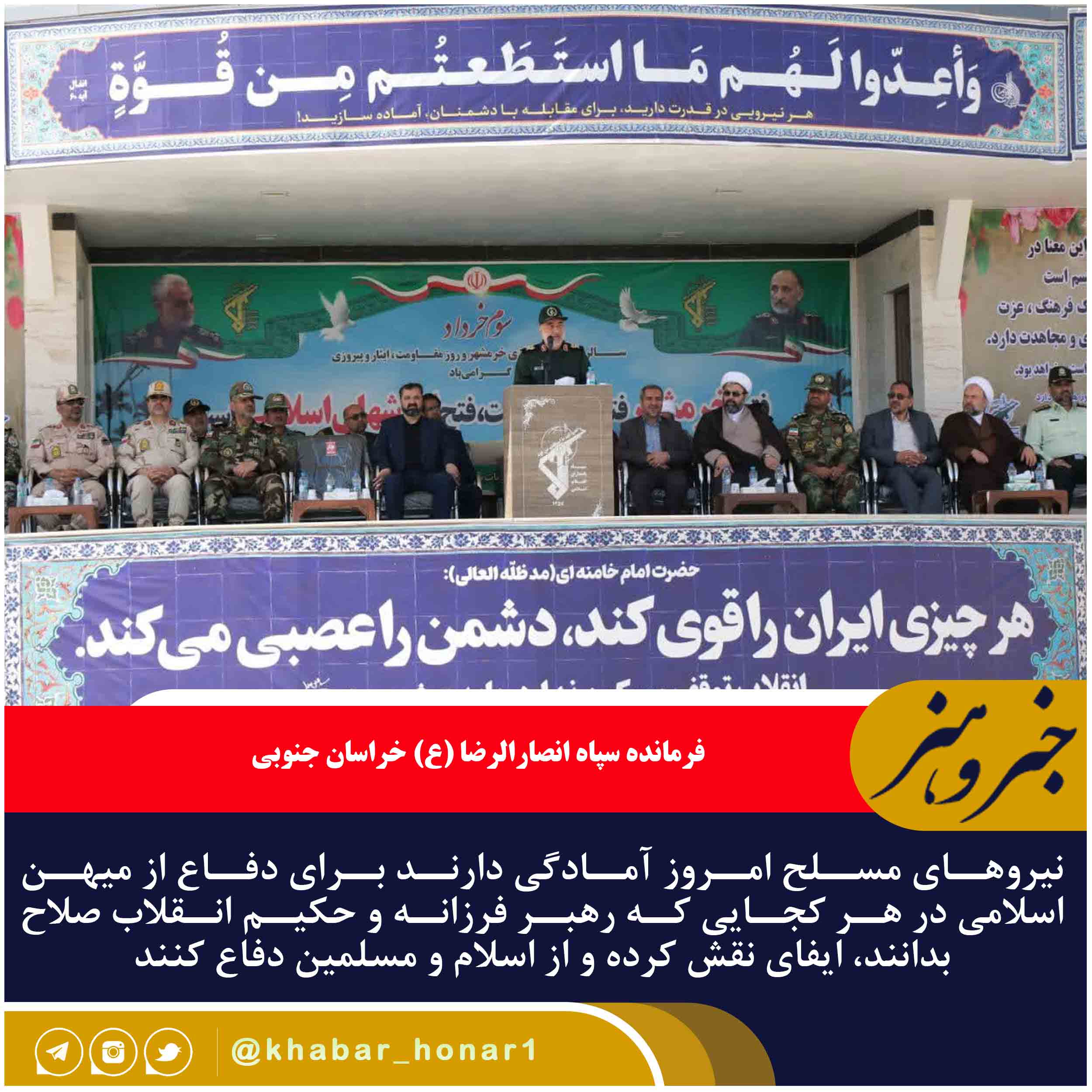 فرمانده سپاه انصارالرضا (ع) خراسان جنوبی اظهار داشت: نیروهای مسلح اعم از ارتش، سپاه، بسیج و فراجا ثابت کردند که هرگز به دشمن و مزدوران داخلی اجازه نخواهند داد با قدرت‌طلبی خدشه‌ای به انقلاب اسلامی وارد کنند.