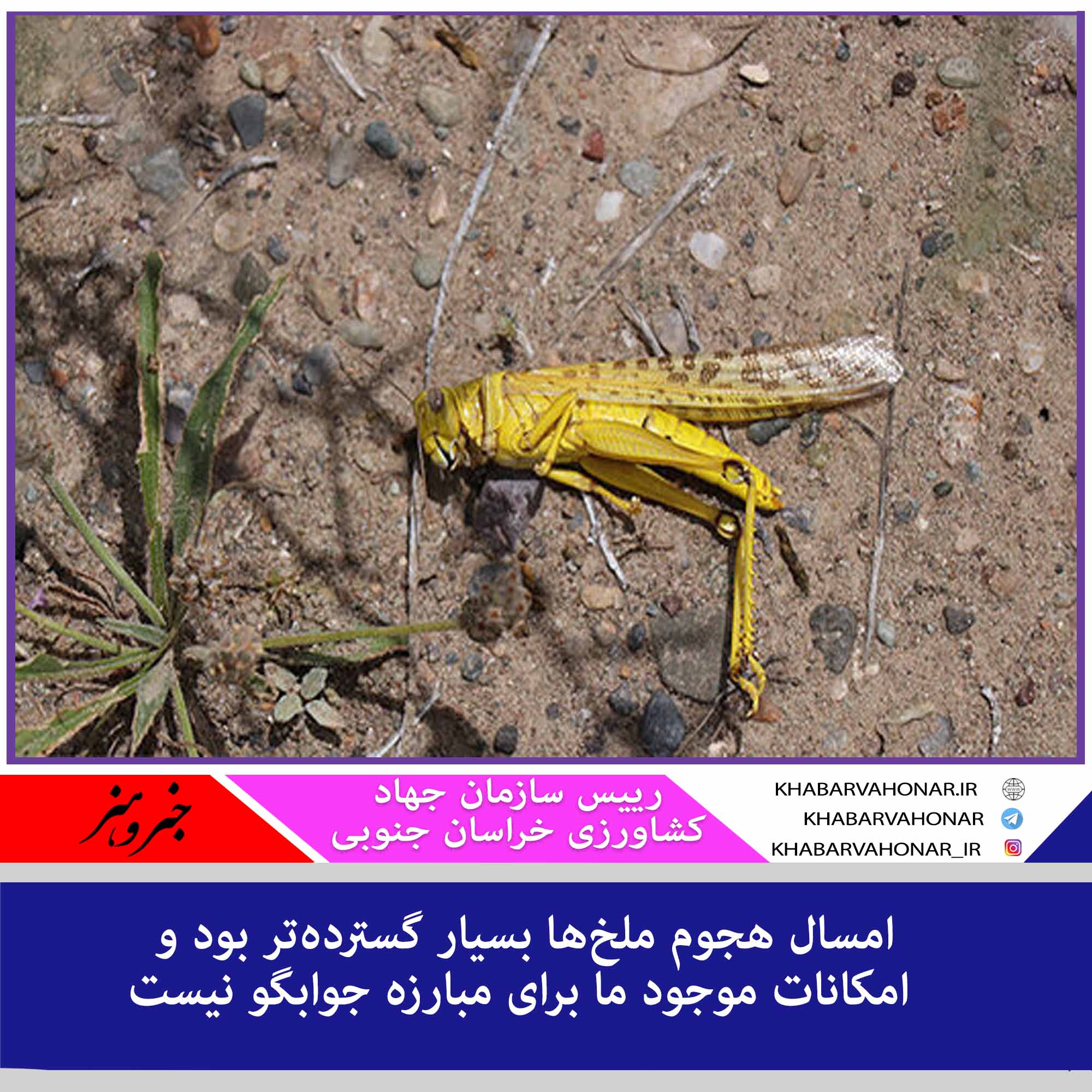 رییس سازمان جهاد کشاورزی خراسان جنوبی با بیان اینکه امسال هجوم ملخها نسبت به سال گذشته، افزایش چند برابری داشته است، گفت: نخستین ریزش ملخ صحرایی مهاجر را در یک هفته گذشته در شهرستان نهبندان شاهد بودیم.