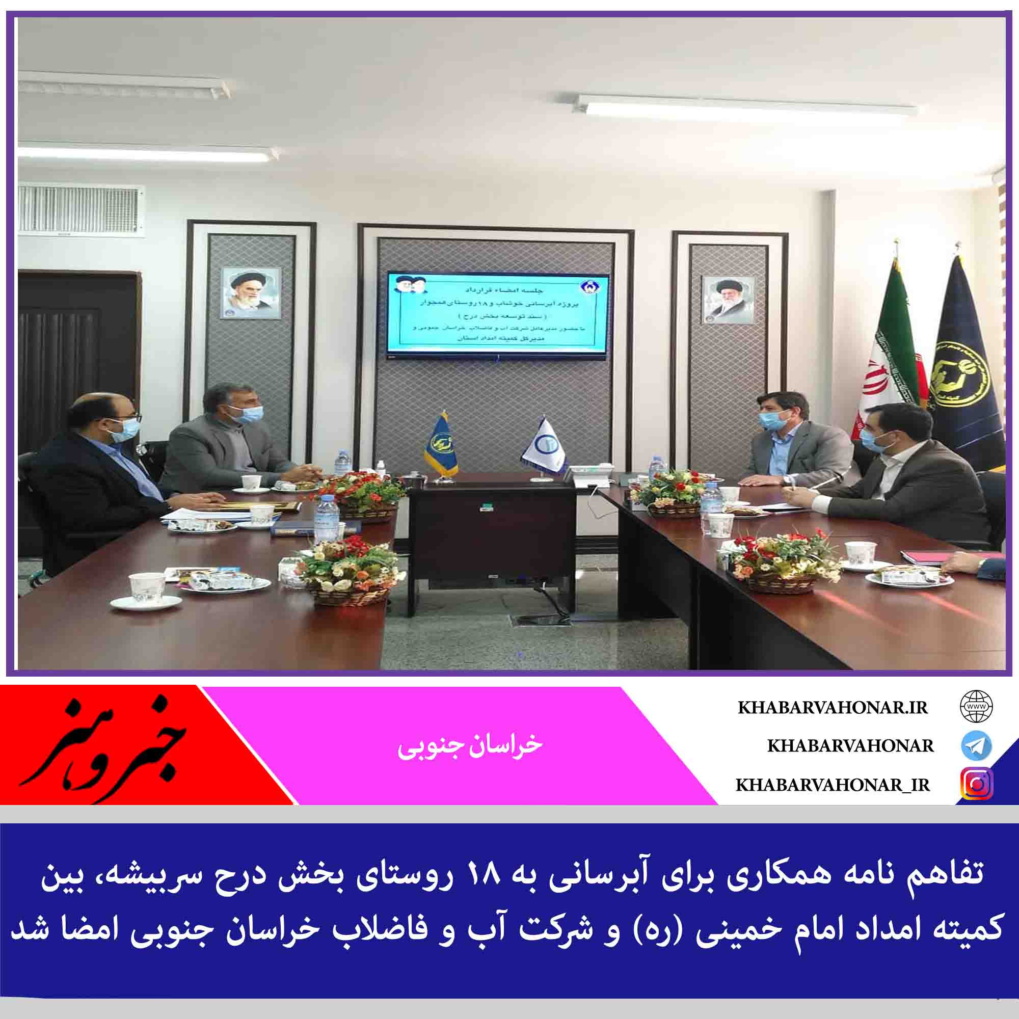 تفاهم نامه همکاری برای آبرسانی به ۱۸ روستای بخش درح سربیشه، بین کمیته امداد امام خمینی (ره) و شرکت آب و فاضلاب خراسان جنوبی امضا شد.