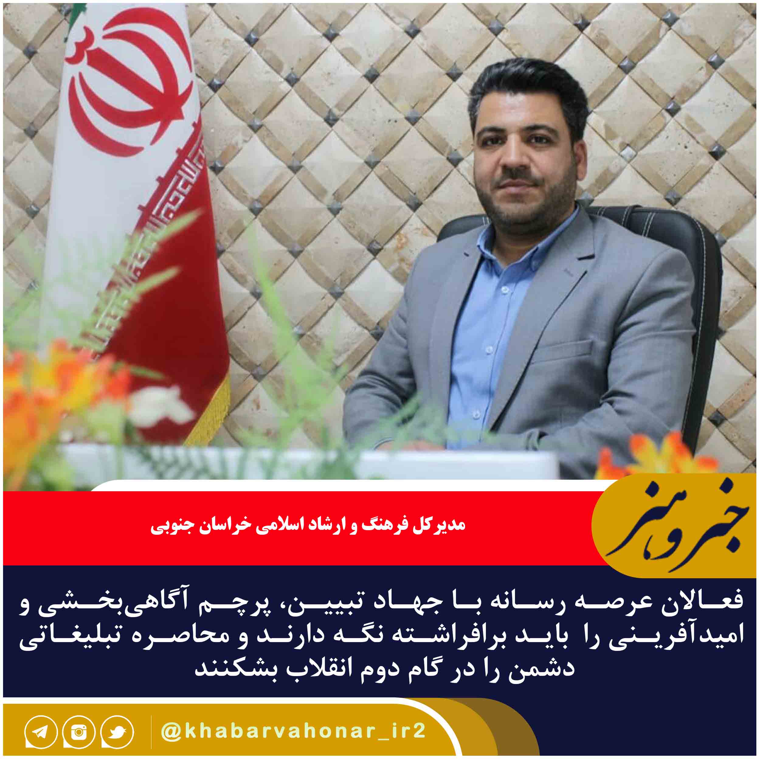 مدیرکل فرهنگ و ارشاد اسلامی خراسان جنوبی گفت: اکنون که نظام سلطه با امپراطوری رسانهای خود به دنبال ناامید کردن جامعه است، میطلبد فعالان عرصه رسانه با جهاد تبیین، پرچم آگاهیبخشی و امیدآفرینی را باید برافراشته نگه دارند و محاصره تبلیغاتی دشمن را در گام دوم انقلاب بشکنند.