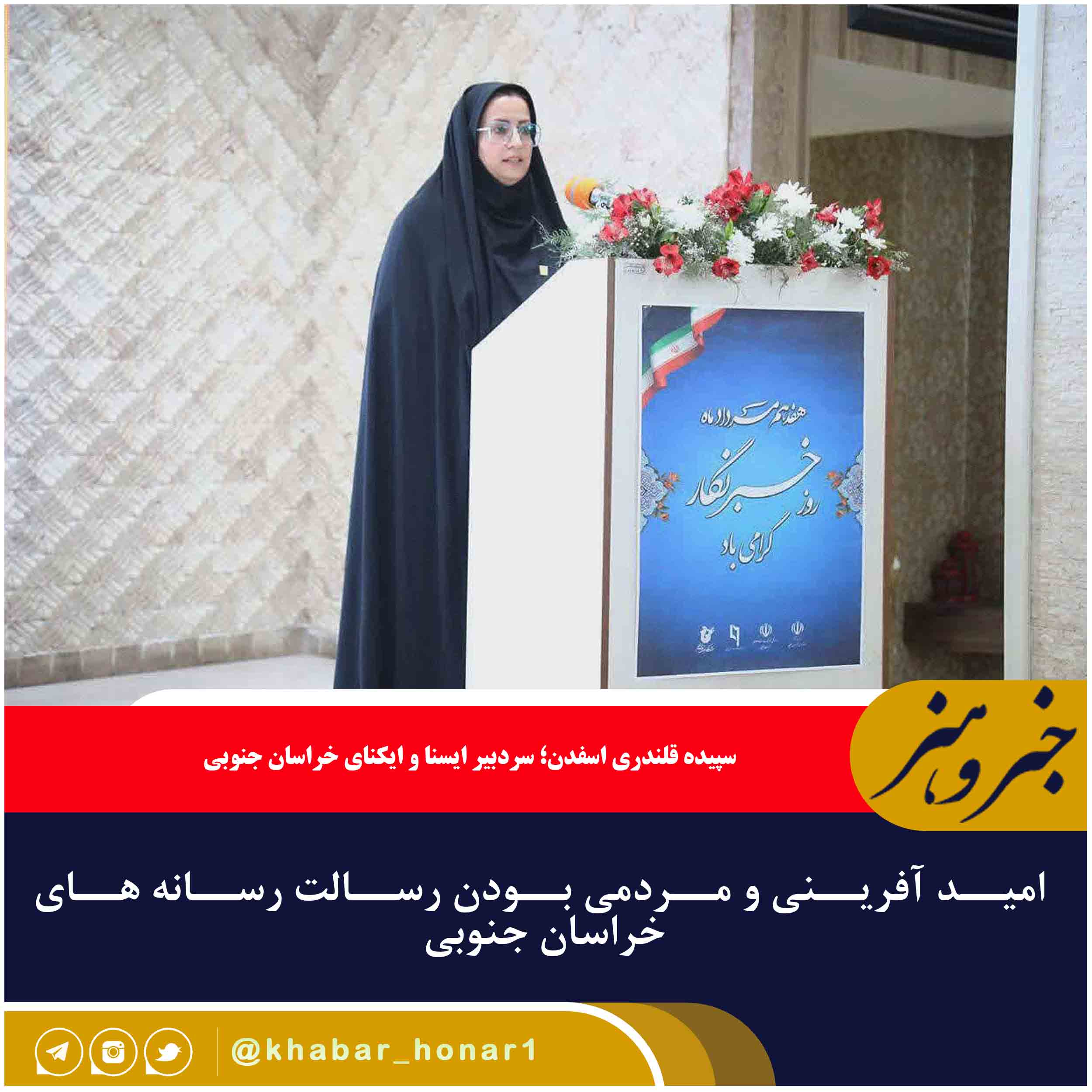 قلندری اسفدن با بیان اینکه امیدواریم پس از تحقق وعده‌ها، شاهد اخبار امیدآفرینی برای مردم از سوی مدیران باشیم، تصریح کرد: از طرفی چه خوب است جایگاه خبرگزاری‌ها به عنوان رسانه ملی در شورای اطلاع رسانی تثبیت شود و از ظرفیت خبرگزاری‌ها و پایگاه‌های خبری استفاده شود.