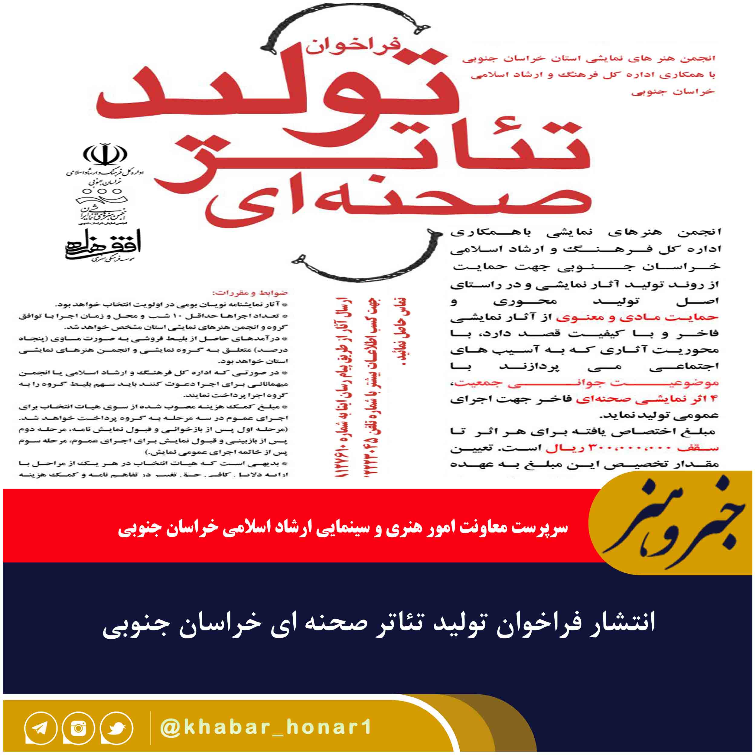 سرپرست معاونت امور هنری و سینمایی اداره کل فرهنگ و ارشاد اسلامی خراسان جنوبی، از فراخوان تولید تئاتر صحنه ای استان خبرداد و گفت: فراخوان از ۲۵ خرداد سالجاری آغاز و آخرین مهلت ارسال طرح های نمایشی ۱۰ تیرماه جاری است. مرضیه صابری با اشاره به پشتیبانی از تولید نمایشنامه و آثار نمایش صحنه ای در سال ۱۴۰۲ اظهار کرد: این اتفاق هنری به همت انجمن نمایش استان و حمایت اداره کل فرهنگ و ارشاد اسلامی خراسان جنوبی برنامه ریزی شده است که دستیابی به ایده های ناب برای تولید و اجرای آثار نمایش صحنه ای هم در قالب نمایشنامه و هم در قالب اجرای آثار باکیفیت از اهمیت ویژه ای برخوردار است لذا با همین نگاه این فراخوان در بخش استانی منتشر شد.