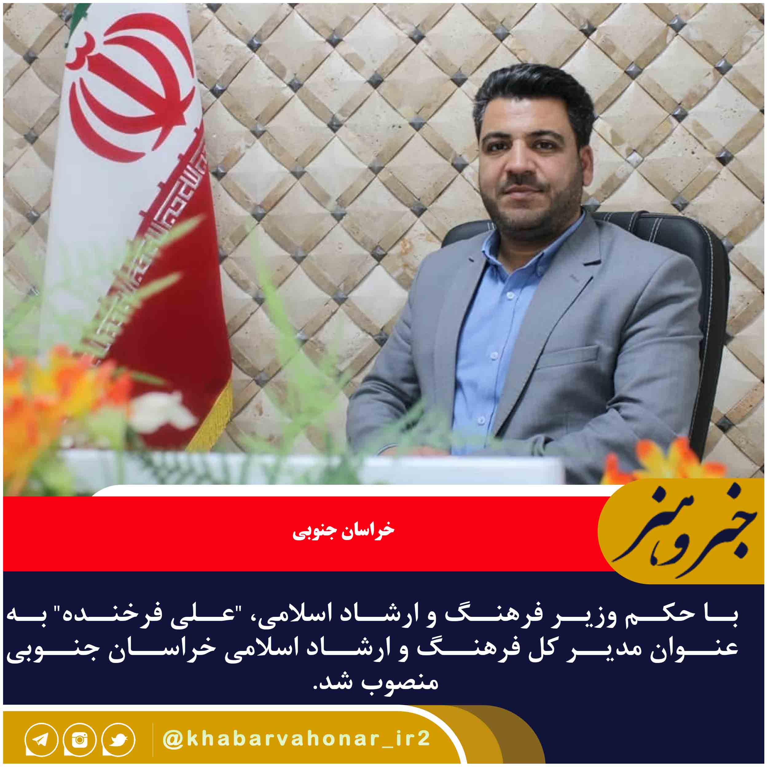 ?با حکم وزیر فرهنگ و ارشاد اسلامی، “علی فرخنده” به عنوان مدیر کل فرهنگ و ارشاد اسلامی خراسان جنوبی منصوب شد.