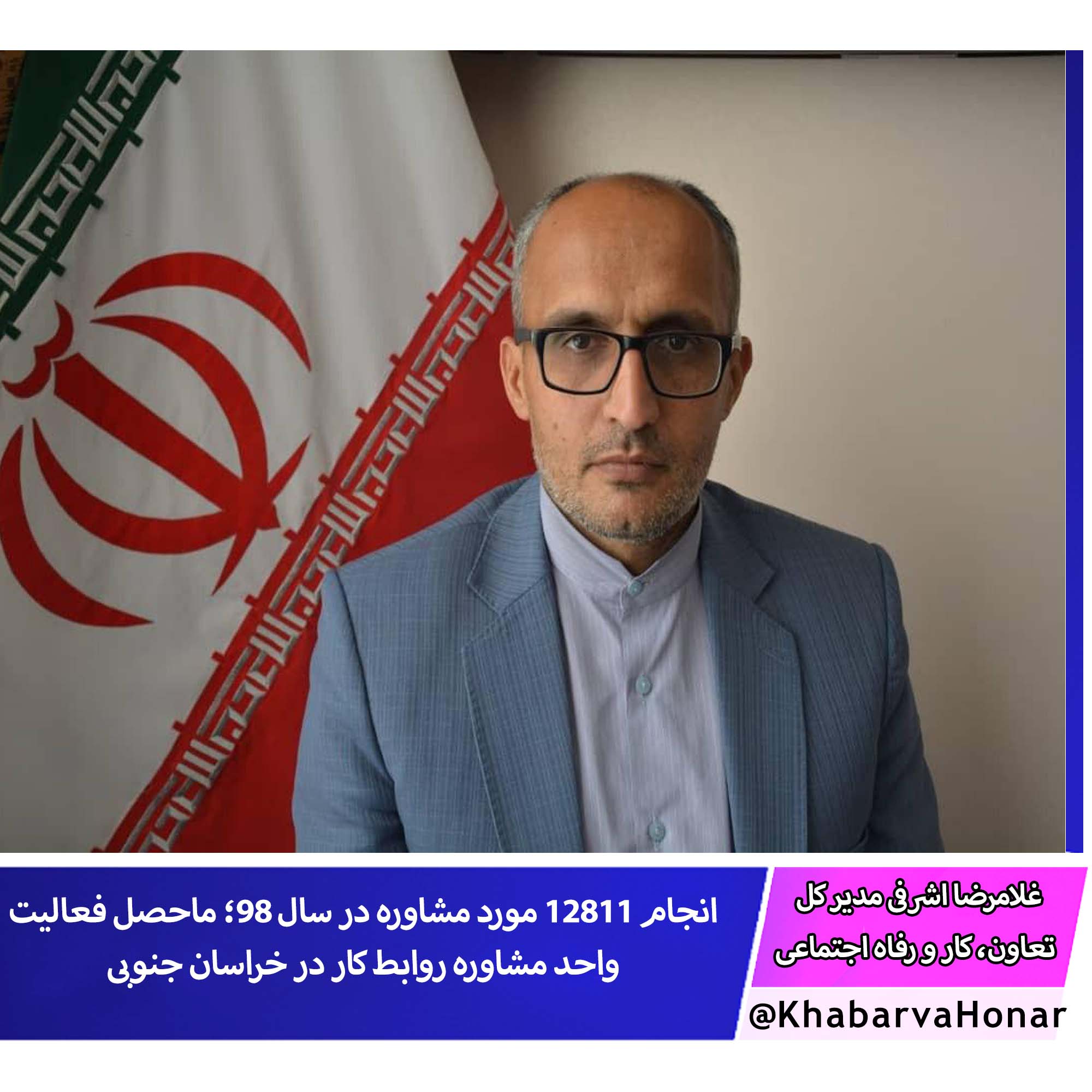 مدیر کل تعاون، کار و رفاه اجتماعی استان از انجام ۱۲۸۱۱ مورد مشاوره در سال ۹۸ در استان خبر داد که از مجموع آن ۶۲۶۶ مورد مشاوره حضوری و ۶۵۴۵ مورد مشاوره تلفنی در حوزه روابط کار بوده است که متعاقب این موضوع، ۱۸۷ مورد از شکایات به صورت سازش مستقیم به نتیجه رسیده است.