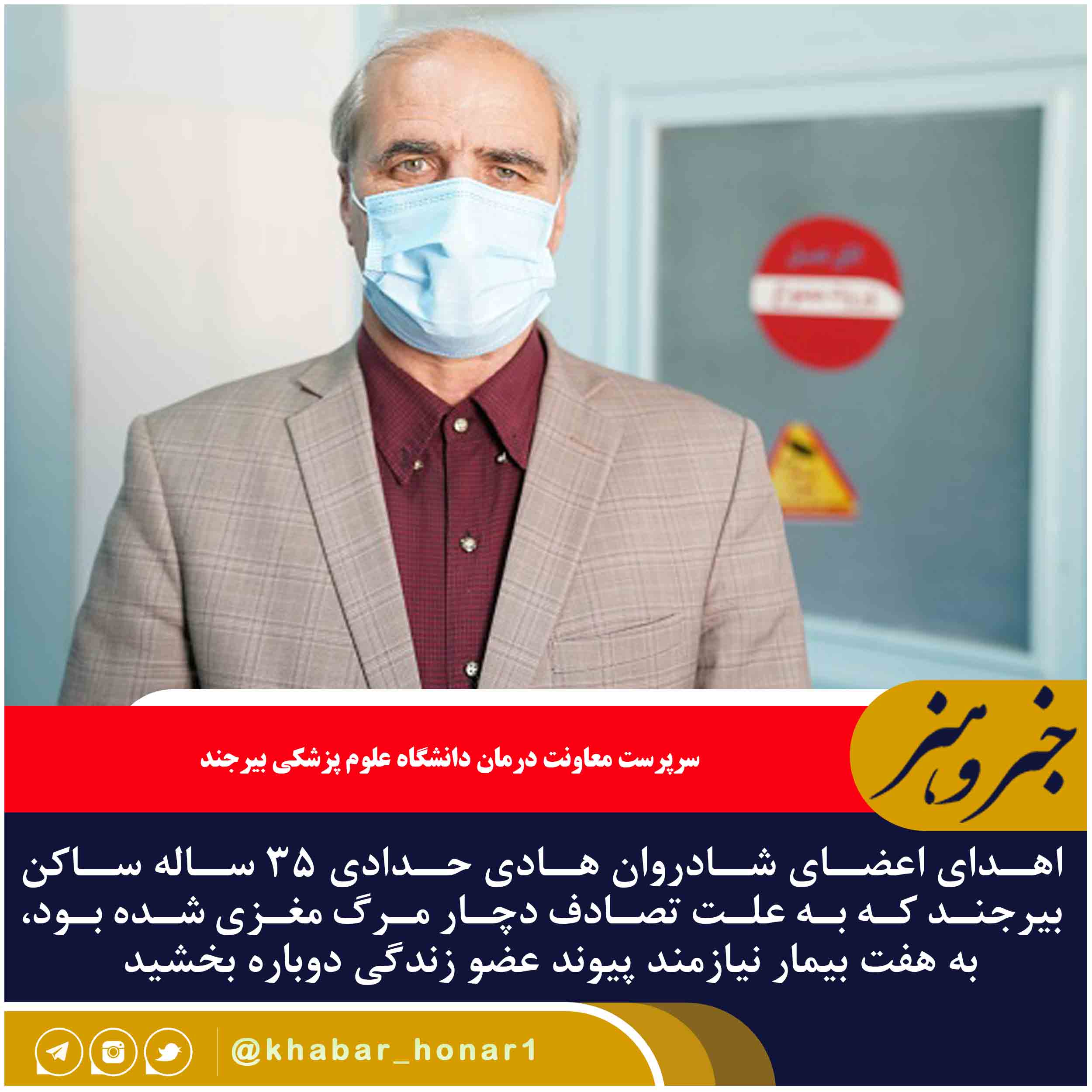 سرپرست معاونت درمان دانشگاه علوم پزشکی بیرجند گفت: اهدای اعضای شادروان هادی حدادی ۳۵ ساله ساکن بیرجند که به علت تصادف دچار مرگ مغزی شده بود، به هفت بیمار نیازمند پیوند عضو زندگی دوباره بخشید.