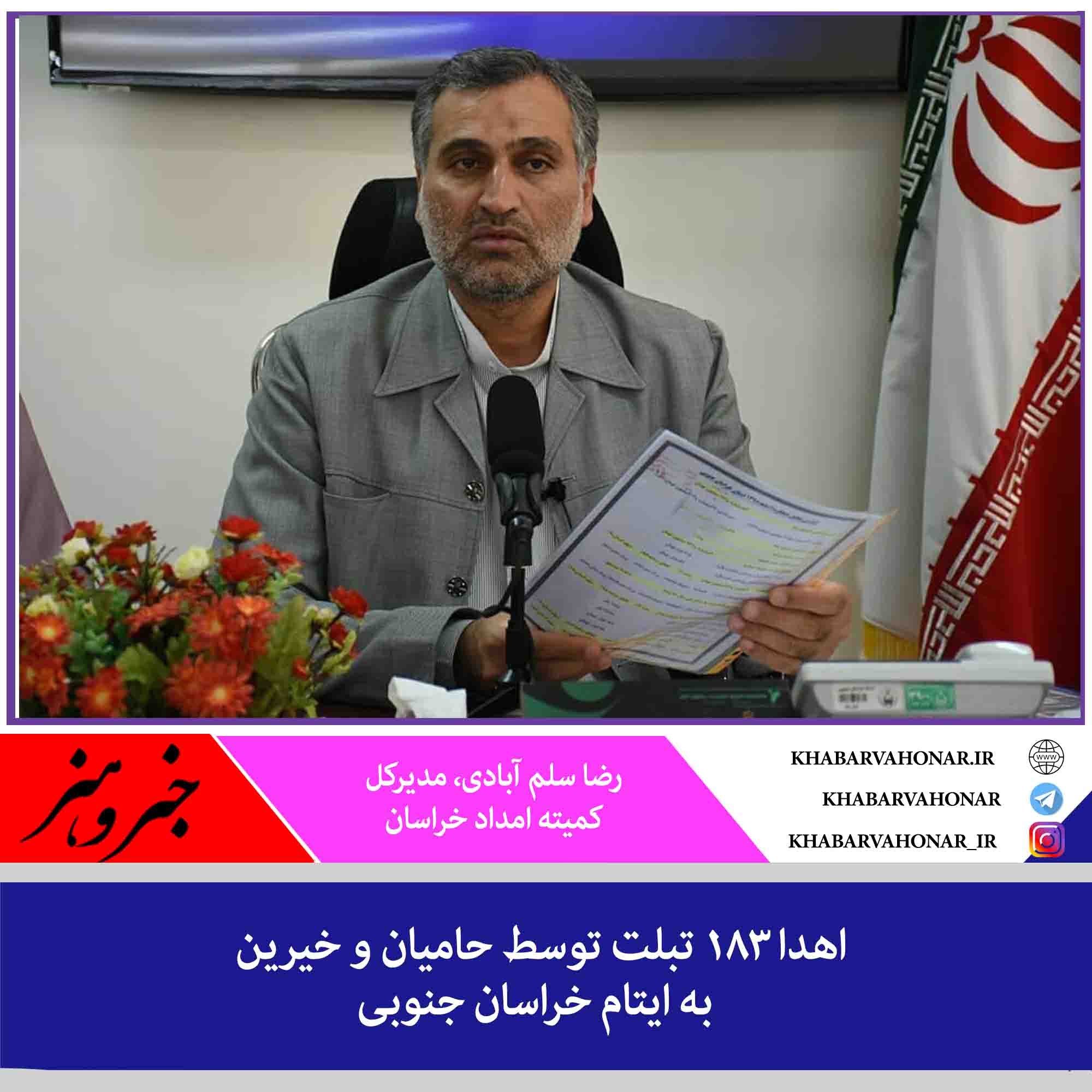 مدیرکل کمیته امداد خراسان جنوبی خاطر نشان کرد: در مرحله قبل ۱۵۴ تبلت به ارزش ۴۶۲ میلیون تومان توسط خیرین و حامیان به ایتام تحت حمایت اهدا شد و در این مرحله ۱۸۳ تبلت به ارزش ۵۵۰ میلیون تومان به ایتام تحت حمایت در سطح استان اهدا شد.