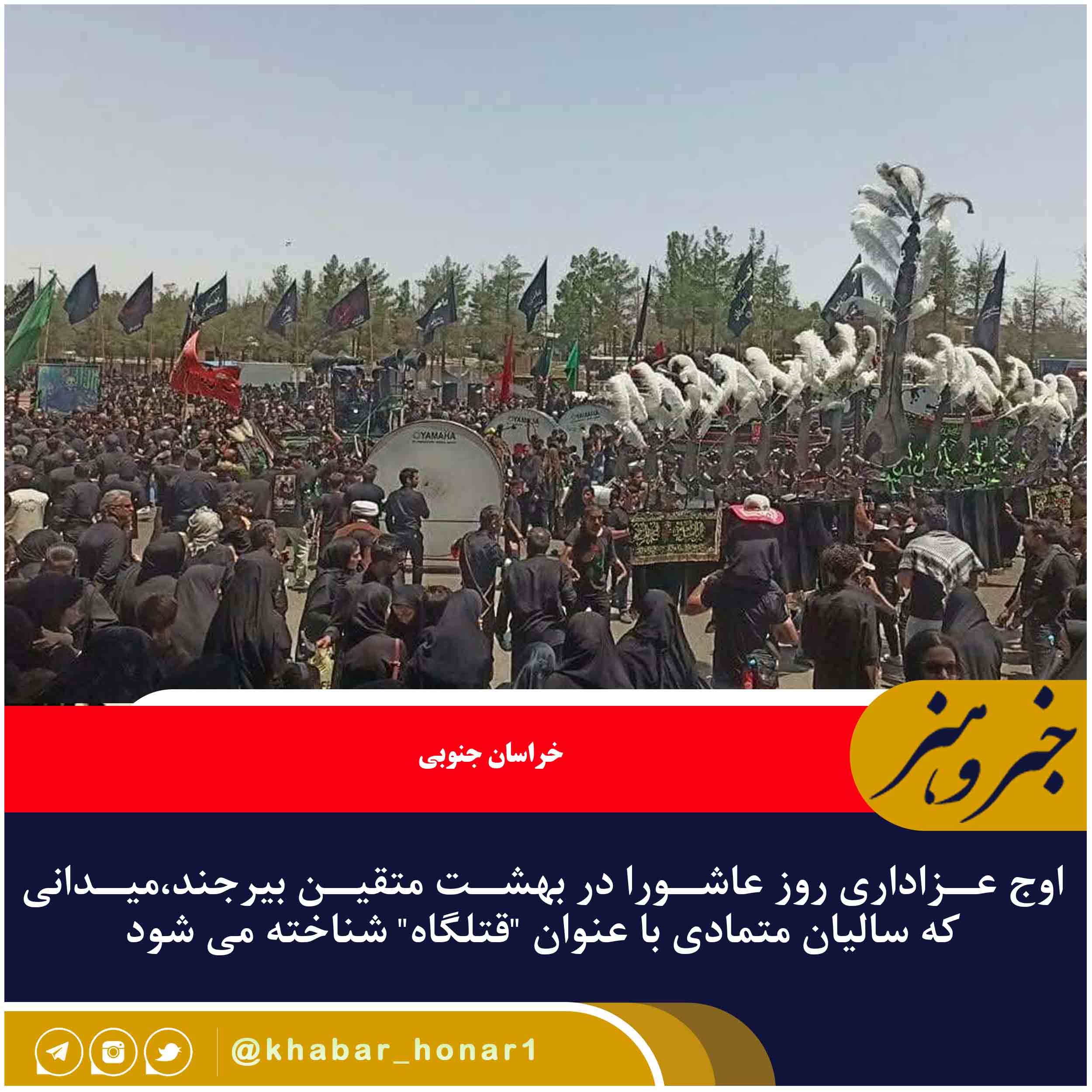 اوج عزاداری روز عاشورا در بهشت متقین بیرجند رقم میخورد؛ میدانی که سالیان متمادی با عنوان “قتلگاه” محل اجتماع هیاتهای مذهبی و قشرهای مختلف مردم این دیار است و نظیر آن در سایر شهرهای خراسان جنوبی هم برگزار میشود.