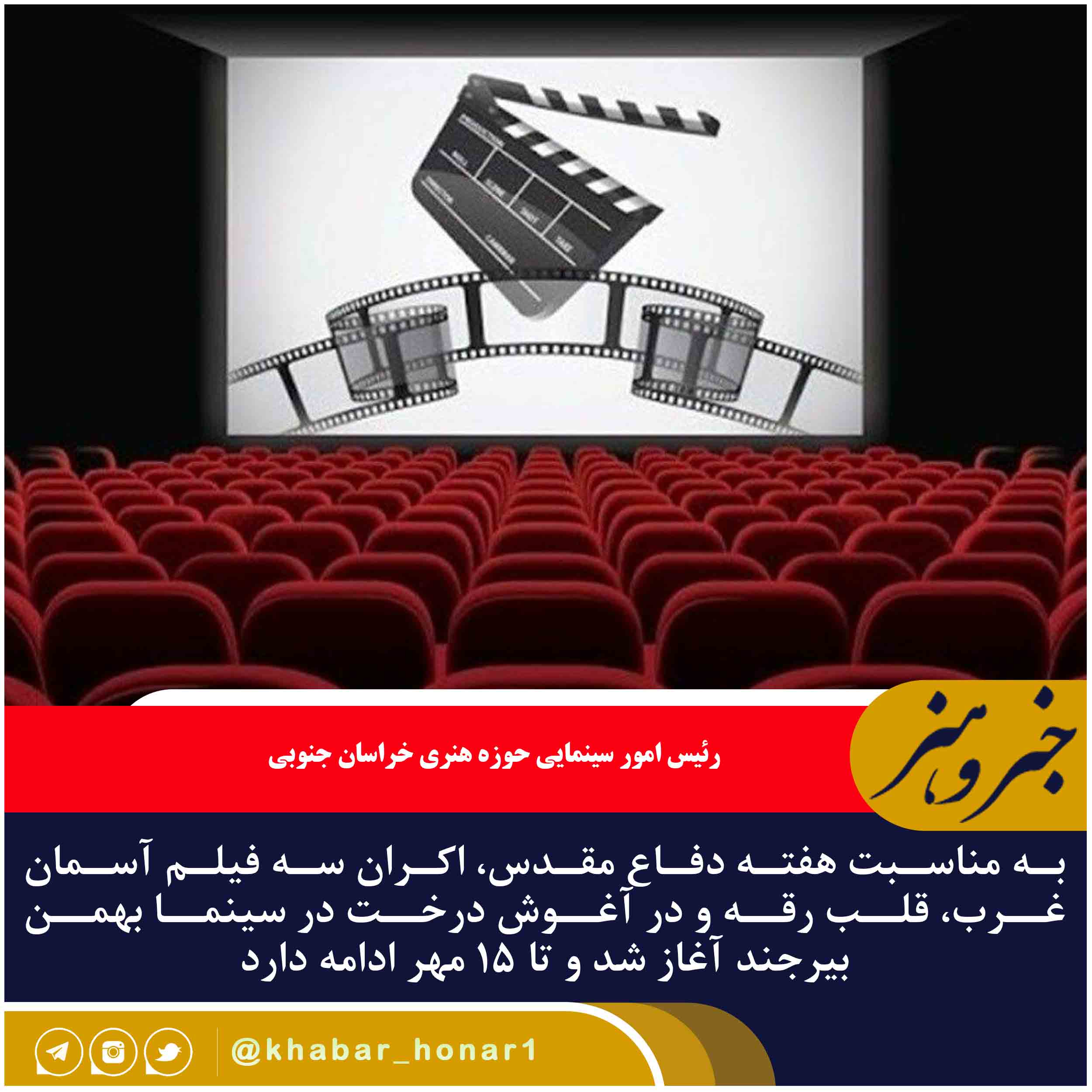رئیس امور سینمایی حوزه هنری خراسان جنوبی گفت: به مناسبت هفته دفاع مقدس، اکران سه فیلم آسمان غرب، قلب رقه و در آغوش درخت در سینما بهمن بیرجند آغاز شد و تا ۱۵ مهر ادامه دارد.