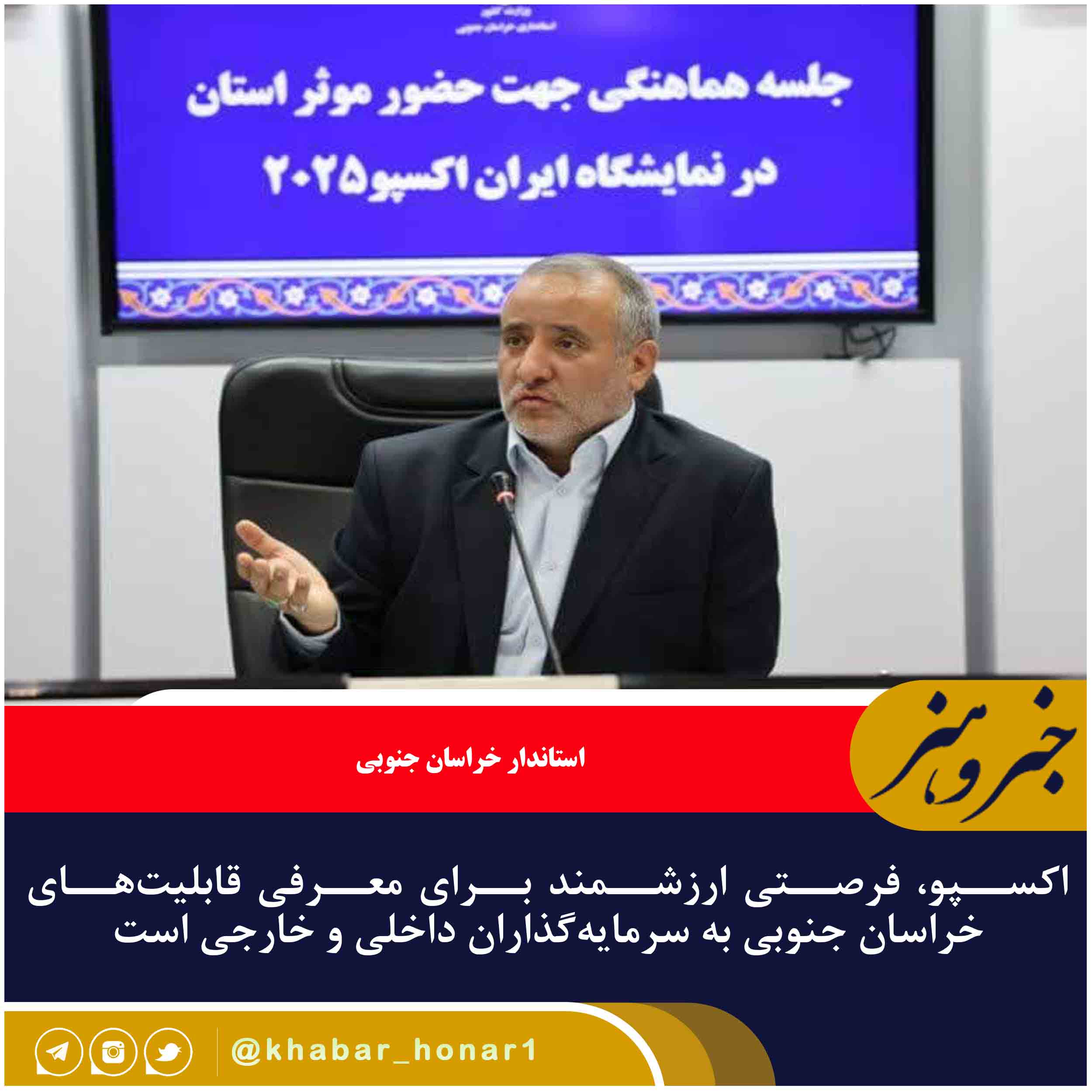 🔹استاندار خراسان جنوبی گفت: ایران اکسپو ۲۰۲۵، فرصتی ارزشمند برای معرفی قابلیتهای استان به سرمایهگذاران داخلی و خارجی است.