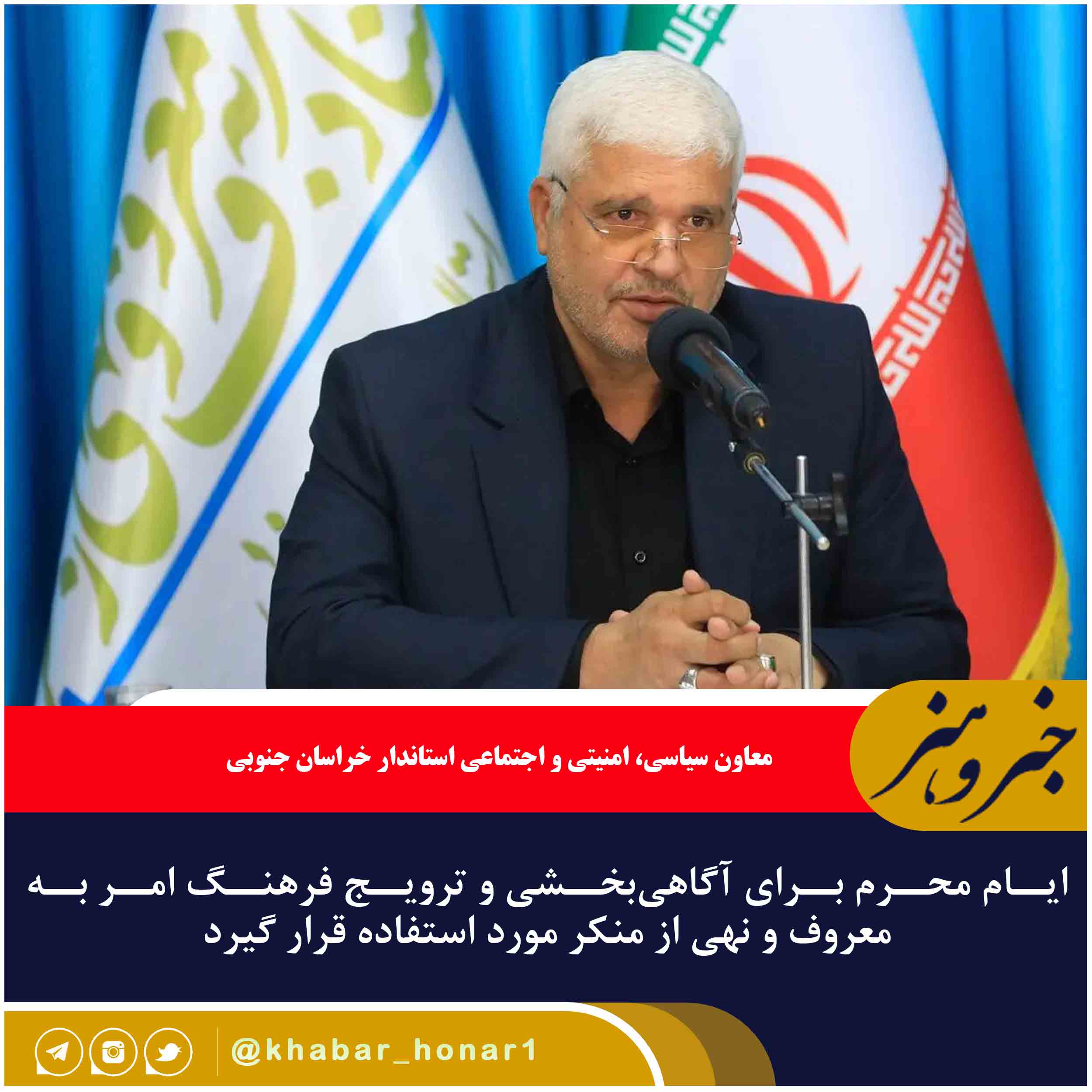 معاون سیاسی، امنیتی و اجتماعی استاندار خراسان جنوبی گفت: در ایام محرم بیشترین حضور مردمی در مساجد و هیئات مذهبی رقم می‌خورد و این ظرفیت باید به‌درستی برای آگاهی‌بخشی و ترویج فرهنگ امر به معروف و نهی از منکر مورد استفاده قرار گیرد.