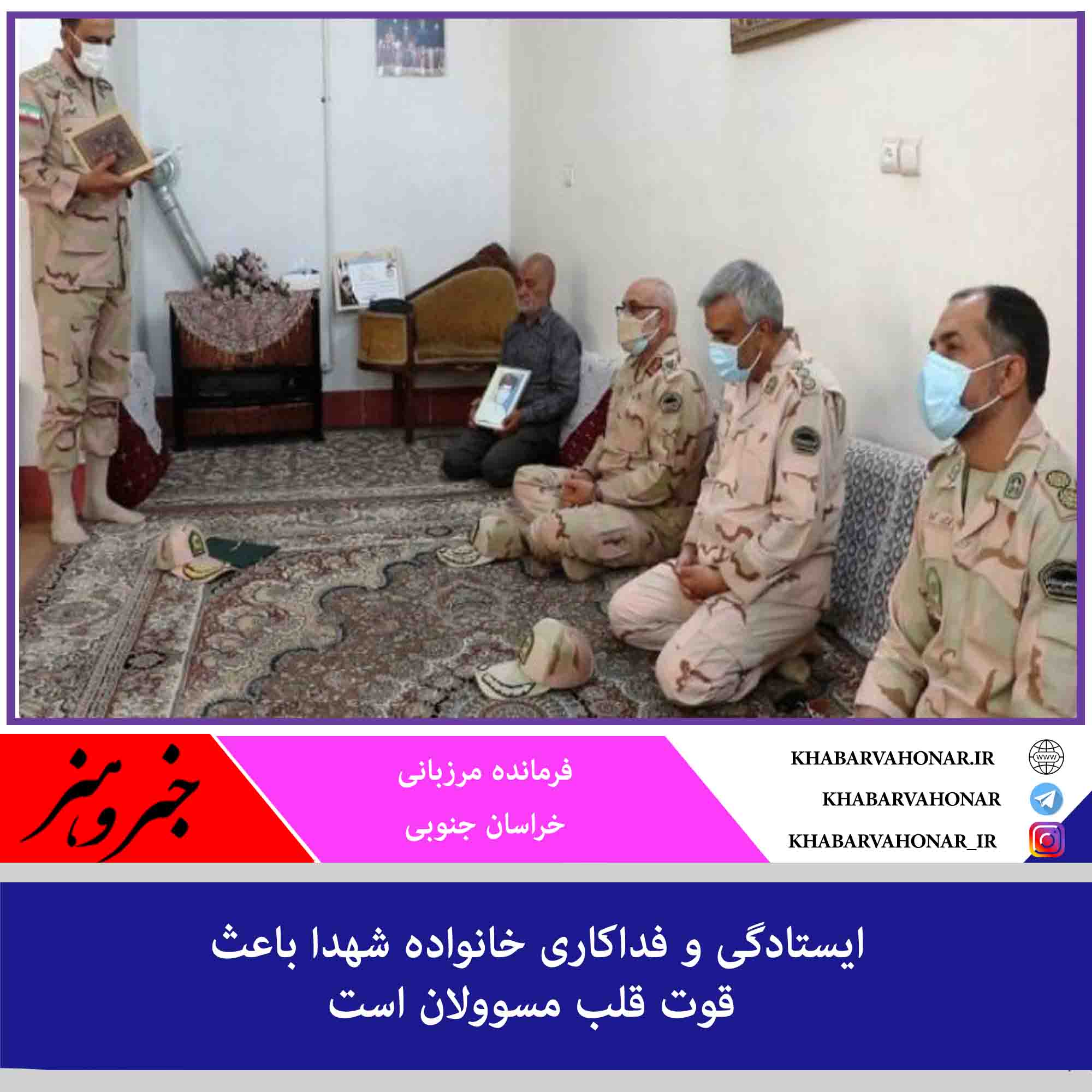 فرمانده مرزبانی خراسان جنوبی اظهار داشت: حقیقتا هر موقع فشار ماموریت و سختی کار به ما دست میدهد دیدار با خانواده معزز شهدا روحیه میدهد.
