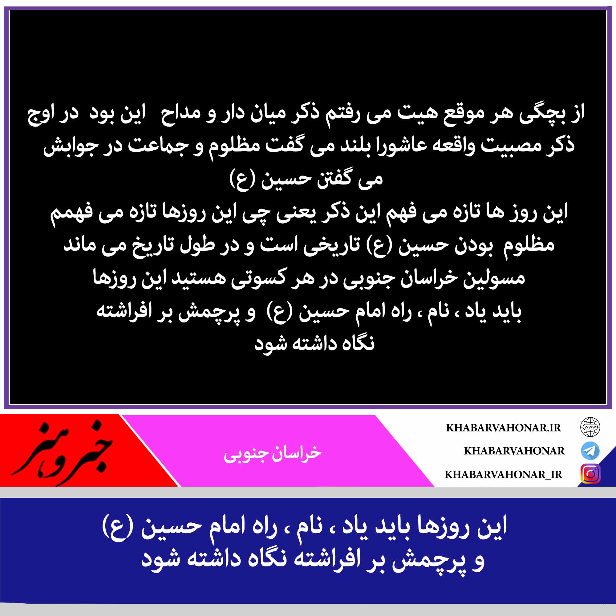 از بچگی هر موقع هیت می رفتم ذکر میان دار و مداح این بود که در اوج ذکر مصبیت واقعه عاشورا بلند می گفت مظلوم و جماعت در جوابش می گفتن حسین (ع) این روز ها تازه می فهم این ذکر یعنی چی این روزها تازه می فهمم مظلوم بودن حسین (ع) تاریخی است و در طول تاریخ می ماند مسولین خراسان جنوبی در هر کسوتی هستید این روزها باید یاد ، نام ، راه امام حسین (ع) و پرچمش بر افراشته نگاه داشته شود