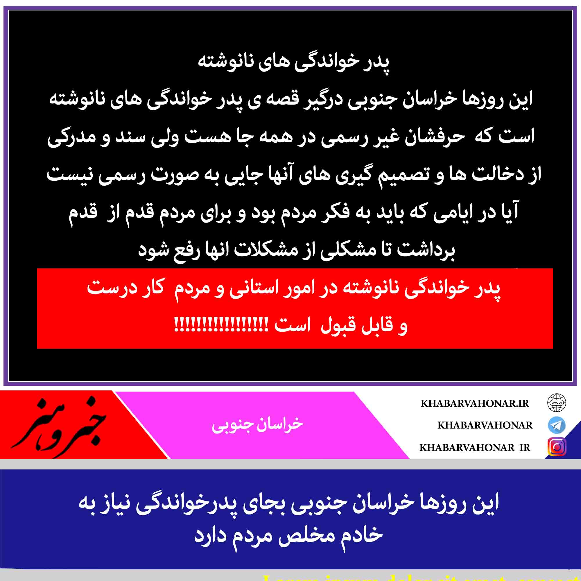 پدر خواندگی های نانوشته این روزها خراسان جنوبی درگیر قصه ی پدر خواندگی های نانوشته است که حرفشان غیر رسمی در همه جا هست ولی سند و مدرکی از دخالت ها و تصمیم گیری های آنها جایی به صورت رسمی نیست آیا در ایامی که باید به فکر مردم بود و برای مردم قدم از قدم برداشت تا مشکلی از مشکلات انها رفع شود پدر خواندگی نانوشته در امور استانی و مردم کار درست و قابل قبول است !!!!!!!!!!!!!!!!!