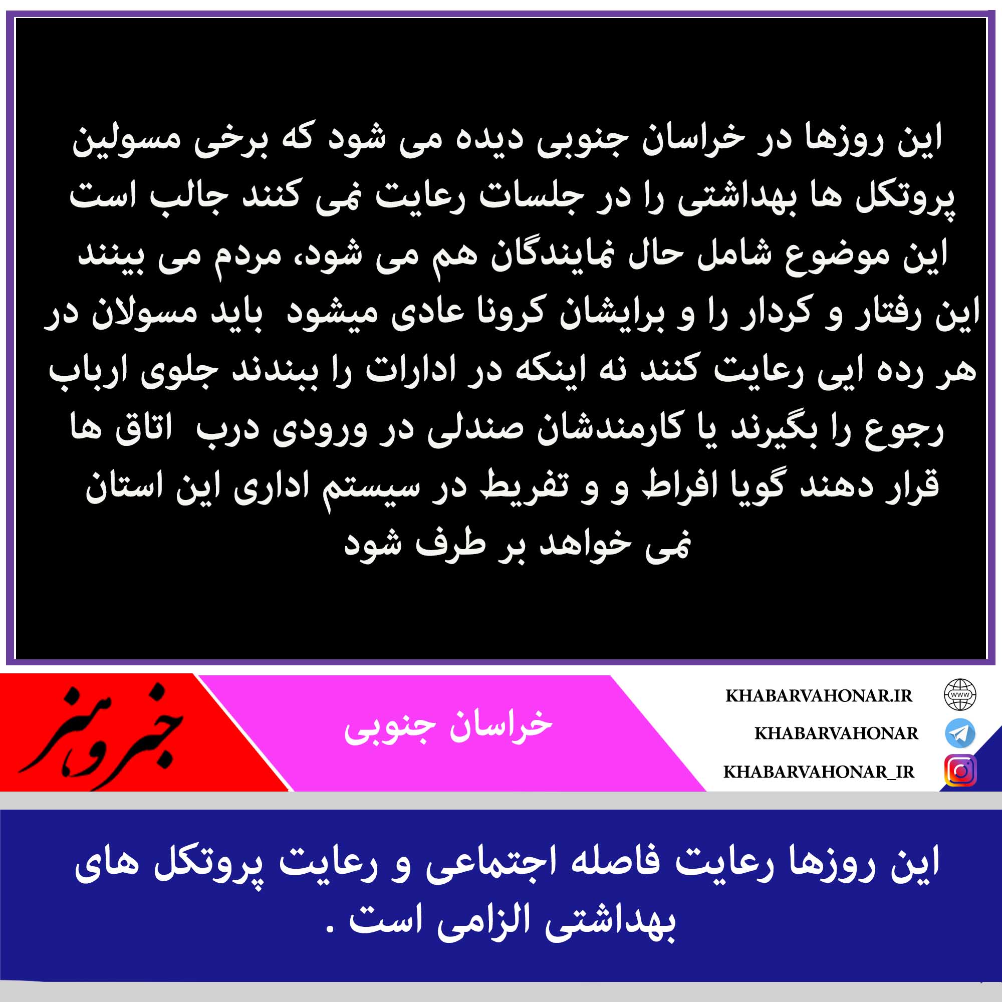 این روزها در خراسان جنوبی دیده می شود که برخی مسولین پروتکل ها بهداشتی را در جلسات رعایت نمی کنند جالب است این موضوع شامل حال نمایندگان هم می شود، مردم می بینند این رفتار و کردار را و برایشان کرونا عادی میشود باید مسولان در هر رده ایی رعایت کنند نه اینکه در ادارات را ببندند جلوی ارباب رجوع را بگیرند یا کارمندشان صندلی در ورودی درب اتاق ها قرار دهند گویا افراط و و تفریط در سیستم اداری این استان نمی خواهد بر طرف شود