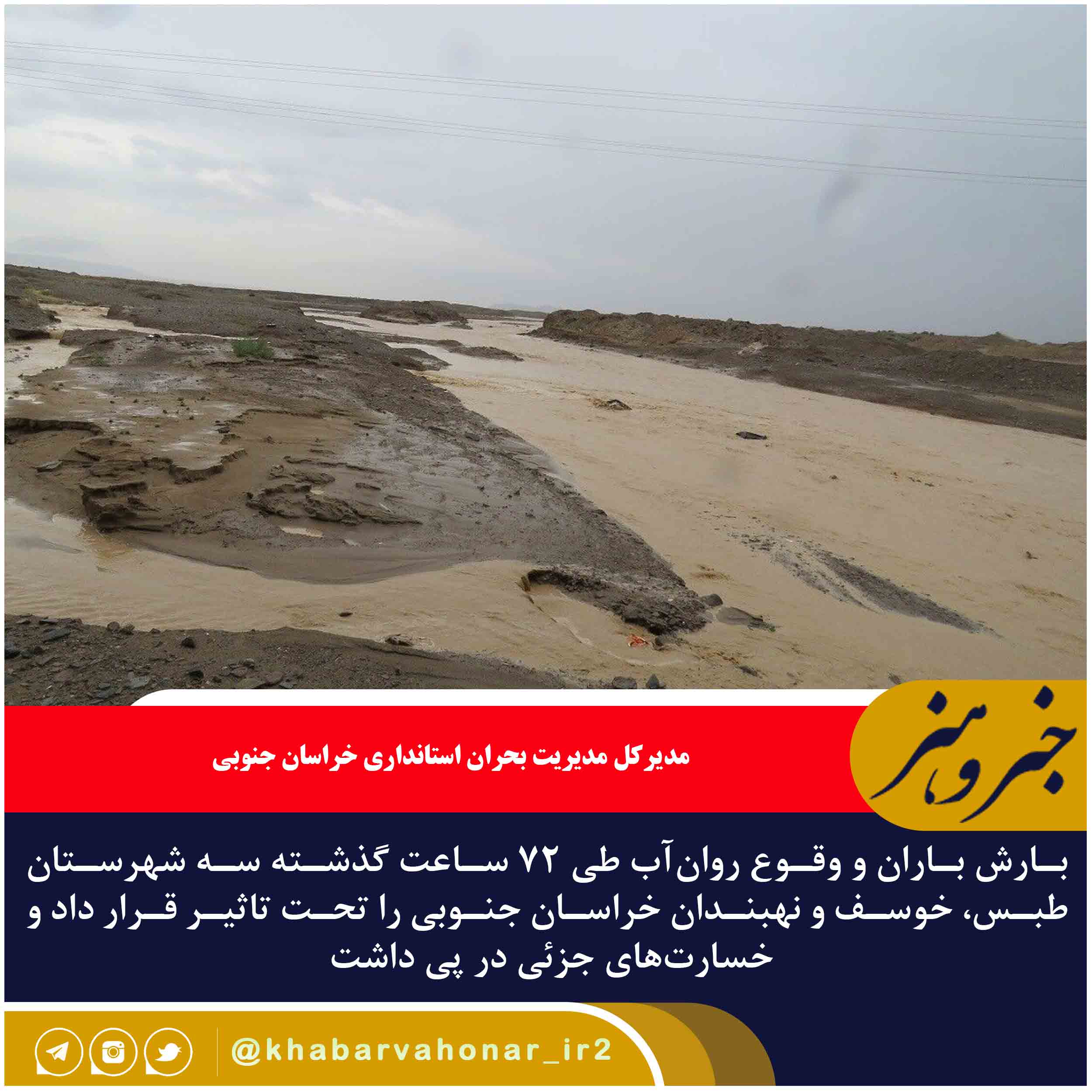مدیرکل مدیریت بحران استانداری خراسان جنوبی گفت: بارش باران و وقوع روانآب طی ۷۲ ساعت گذشته سه شهرستان خراسان جنوبی را تحت تاثیر قرار داد و خسارتهای جزئی در پی داشت.