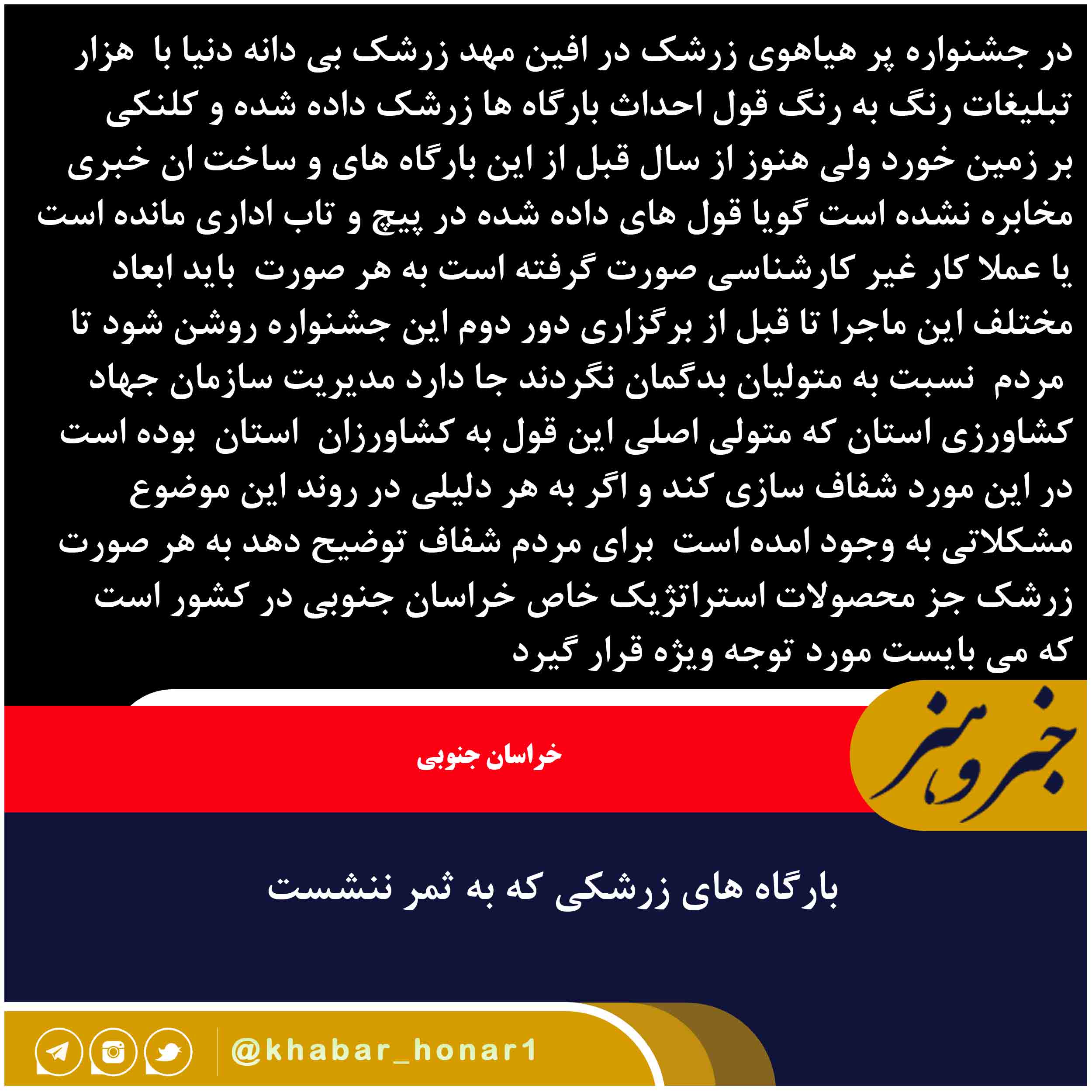 در جشنواره پر هیاهوی زرشک در افین مهد زرشک بی دانه دنیا با هزار تبلیغات رنگ به رنگ قول احداث بارگاه ها زرشک داده شده و کلنکی بر زمین خورد ولی هنوز از سال قبل از این بارگاه های و ساخت ان خبری مخابره نشده است گویا قول های داده شده در پیچ و تاب اداری مانده است یا عملا کار غیر کارشناسی صورت گرفته است به هر صورت باید ابعاد مختلف این ماجرا تا قبل از برگزاری دور دوم این جشنواره روشن شود تا مردم نسبت به متولیان بدگمان نگردند جا دارد مدیریت سازمان جهاد کشاورزی استان که متولی اصلی این قول به کشاورزان استان بوده است در این مورد شفاف سازی کند و اگر به هر دلیلی در روند این موضوع مشکلاتی به وجود امده است برای مردم شفاف توضیح دهد به هر صورت زرشک جز محصولات استراتژیک خاص خراسان جنوبی در کشور است که می بایست مورد توجه ویژه قرار گیرد